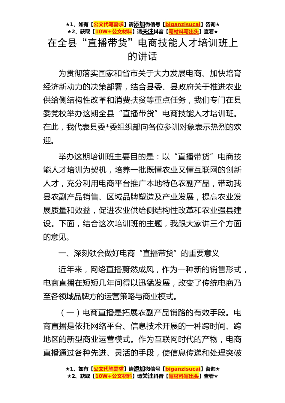 ★1、如有【公文代笔需求】请添加微信号【biganzisucai】咨询★★2、获取【10W+公文材料】请关注抖音【写材料写出头】查看★★1、如有【公文代笔需求】请添加微信号【biganzisucai】咨询★★2、获取【10W+公文材料】请关注抖音【写材料写出头】查看★★1、如有【公文代笔需求】请添加微信号【biganzisucai】咨询★★2、获取【10W+公文材料】请关注抖音【写材料写出头】查看★在全县“直播带货”电商技能人才培训班上的讲话为贯彻落实国家和省市关于大力发展电商、加快培育经济新动力的决策部署,结合县委、县政府关于推进农业供给侧结构性改革和消费扶贫等重点任务,我们专门在县委党校举办这期全县“直播带货”电商技能人才培训班。在此,我代表县委*委组织部向各位参训对象表示热烈的欢迎。举办这期培训班主要目...