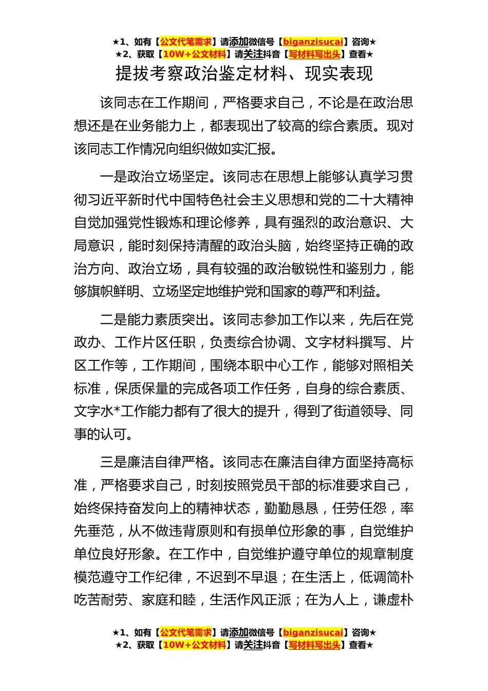 ★1、如有【公文代笔需求】请添加微信号【biganzisucai】咨询★★2、获取【10W+公文材料】请关注抖音【写材料写出头】查看★★1、如有【公文代笔需求】请添加微信号【biganzisucai】咨询★★2、获取【10W+公文材料】请关注抖音【写材料写出头】查看★★1、如有【公文代笔需求】请添加微信号【biganzisucai】咨询★★2、获取【10W+公文材料】请关注抖音【写材料写出头】查看★提拔考察政治鉴定材料、现实表现该同志在工作期间,严格要求自己,不论是在政治思想还是在业务能力上,都表现出了较高的综合素质。现对该同志工作情况向组织做如实汇报。一是政治立场坚定。该同志在思想上能够认真学习贯彻习近平新时代中国特色社会主义思想和党的二十大精神自觉加强党性锻炼和理论修养,具有强烈的政治意识、大局意识,能...