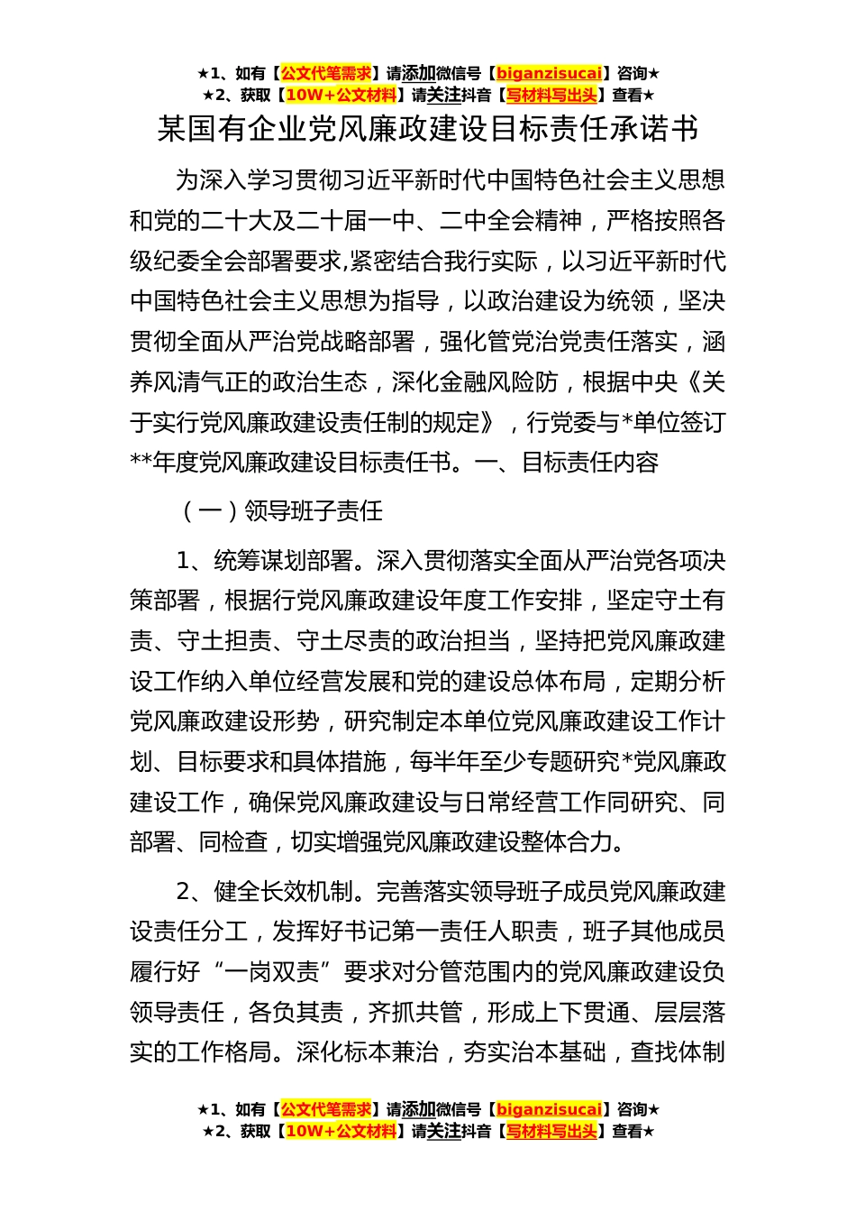 ★1、如有【公文代笔需求】请添加微信号【biganzisucai】咨询★★2、获取【10W+公文材料】请关注抖音【写材料写出头】查看★★1、如有【公文代笔需求】请添加微信号【biganzisucai】咨询★★2、获取【10W+公文材料】请关注抖音【写材料写出头】查看★★1、如有【公文代笔需求】请添加微信号【biganzisucai】咨询★★2、获取【10W+公文材料】请关注抖音【写材料写出头】查看★某国有企业党风廉政建设目标责任承诺书为深入学习贯彻习近平新时代中国特色社会主义思想和党的二十大及二十届一中、二中全会精神,严格按照各级纪委全会部署要求,紧密结合我行实际,以习近平新时代中国特色社会主义思想为指导,以政治建设为统领,坚决贯彻全面从严治党战略部署,强化管党治党责任落实,涵养风清气正的政治生态,深化金融风...