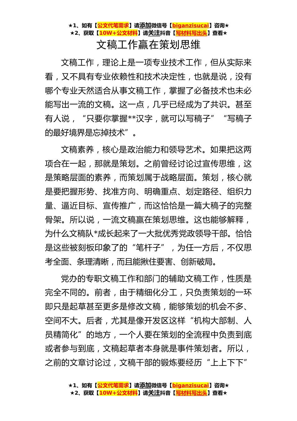 ★1、如有【公文代笔需求】请添加微信号【biganzisucai】咨询★★2、获取【10W+公文材料】请关注抖音【写材料写出头】查看★★1、如有【公文代笔需求】请添加微信号【biganzisucai】咨询★★2、获取【10W+公文材料】请关注抖音【写材料写出头】查看★★1、如有【公文代笔需求】请添加微信号【biganzisucai】咨询★★2、获取【10W+公文材料】请关注抖音【写材料写出头】查看★文稿工作赢在策划思维文稿工作,理论上是一项专业技术工作,但从实际来看,又不具有专业依赖性和技术决定性,也就是说,没有哪个专业天然适合从事文稿工作,掌握了必备技术也未必能写出一流的文稿。这一点,几乎已经成为了共识。甚至有人说,“只要你掌握**汉字,就可以写稿子”“写稿子的最好境界是忘掉技术”。文稿素养,核心是政治能力...