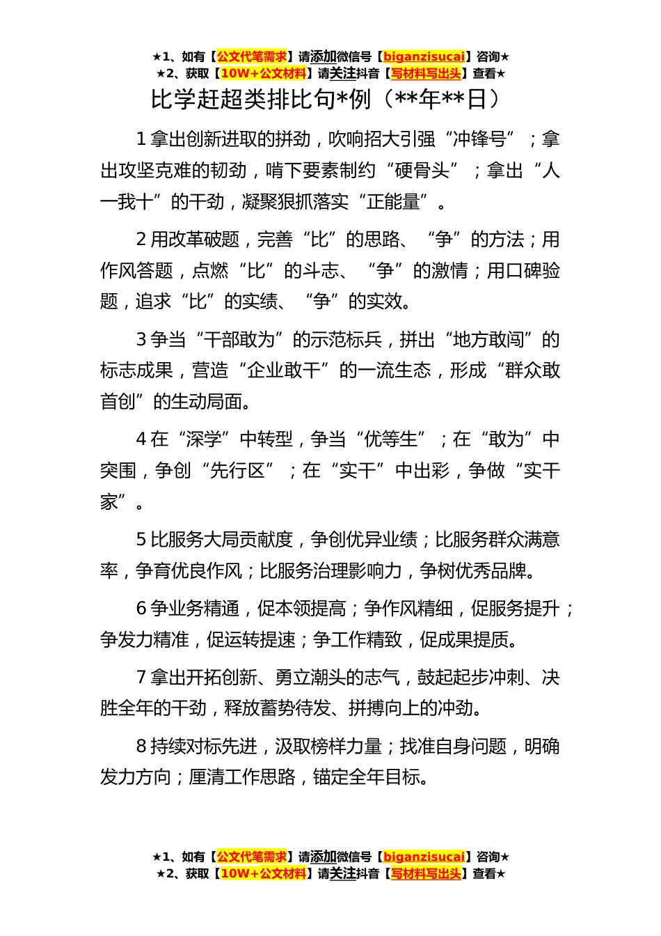 ★1、如有【公文代笔需求】请添加微信号【biganzisucai】咨询★★2、获取【10W+公文材料】请关注抖音【写材料写出头】查看★★1、如有【公文代笔需求】请添加微信号【biganzisucai】咨询★★2、获取【10W+公文材料】请关注抖音【写材料写出头】查看★★1、如有【公文代笔需求】请添加微信号【biganzisucai】咨询★★2、获取【10W+公文材料】请关注抖音【写材料写出头】查看★比学赶超类排比句*例(**年**日)1拿出创新进取的拼劲,吹响招大引强“冲锋号”;拿出攻坚克难的韧劲,啃下要素制约“硬骨头”;拿出“人一我十”的干劲,凝聚狠抓落实“正能量”。2用改革破题,完善“比”的思路、“争”的方法;用作风答题,点燃“比”的斗志、“争”的激情;用口碑验题,追求“比”的实绩、“争”的实效。3争当“干部敢...