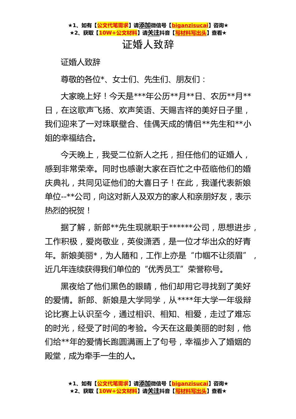 ★1、如有【公文代笔需求】请添加微信号【biganzisucai】咨询★★2、获取【10W+公文材料】请关注抖音【写材料写出头】查看★★1、如有【公文代笔需求】请添加微信号【biganzisucai】咨询★★2、获取【10W+公文材料】请关注抖音【写材料写出头】查看★★1、如有【公文代笔需求】请添加微信号【biganzisucai】咨询★★2、获取【10W+公文材料】请关注抖音【写材料写出头】查看★证婚人致辞证婚人致辞尊敬的各位*、女士们、先生们、朋友们:大家晚上好!今天是***年公历**月**日、农历**月**日,在这歌声飞扬、欢声笑语、天赐吉祥的美好日子里,我们迎来了一对珠联壁合、佳偶天成的情侣**先生和**小姐的幸福结合。今天晚上,我受二位新人之托,担任他们的证婚人,感到非常荣幸。同时也感谢大家在百忙之中莅临他们的婚...