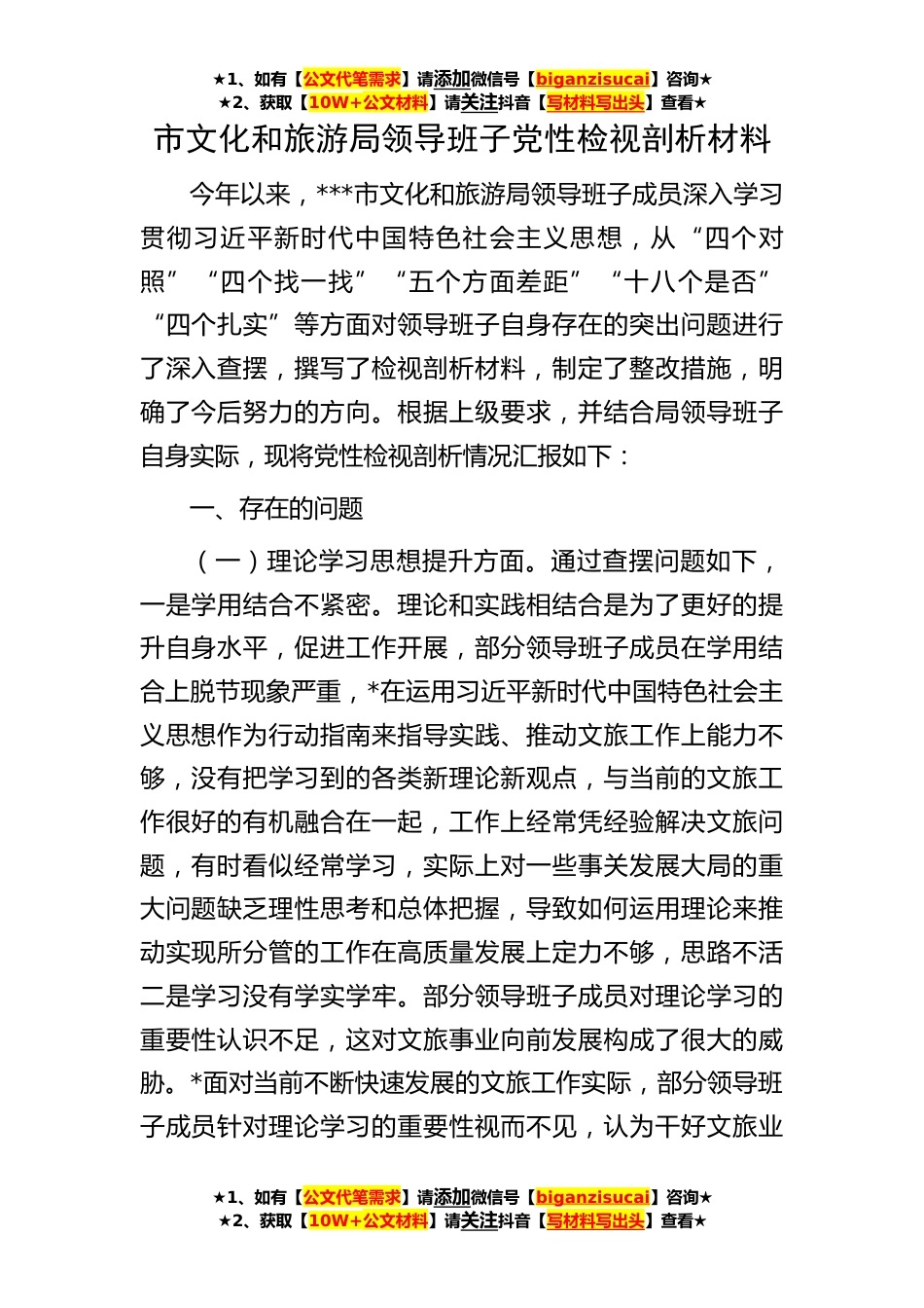 ★1、如有【公文代笔需求】请添加微信号【biganzisucai】咨询★★2、获取【10W+公文材料】请关注抖音【写材料写出头】查看★★1、如有【公文代笔需求】请添加微信号【biganzisucai】咨询★★2、获取【10W+公文材料】请关注抖音【写材料写出头】查看★★1、如有【公文代笔需求】请添加微信号【biganzisucai】咨询★★2、获取【10W+公文材料】请关注抖音【写材料写出头】查看★市文化和旅游局领导班子党性检视剖析材料今年以来,***市文化和旅游局领导班子成员深入学习贯彻习近平新时代中国特色社会主义思想,从“四个对照”“四个找一找”“五个方面差距”“十八个是否”“四个扎实”等方面对领导班子自身存在的突出问题进行了深入查摆,撰写了检视剖析材料,制定了整改措施,明确了今后努力的方向。根据上级要求,...