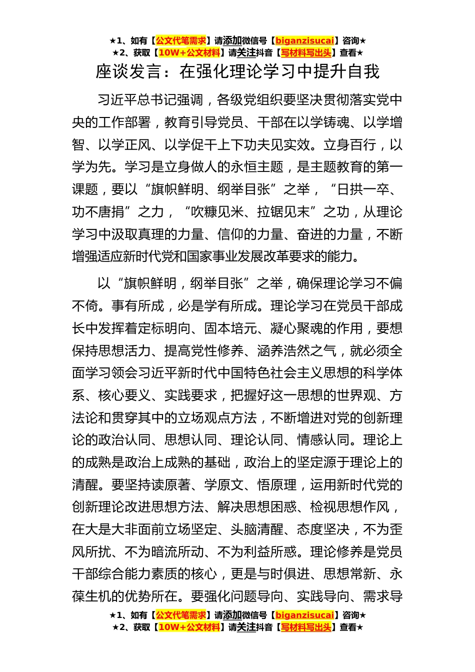 ★1、如有【公文代笔需求】请添加微信号【biganzisucai】咨询★★2、获取【10W+公文材料】请关注抖音【写材料写出头】查看★★1、如有【公文代笔需求】请添加微信号【biganzisucai】咨询★★2、获取【10W+公文材料】请关注抖音【写材料写出头】查看★★1、如有【公文代笔需求】请添加微信号【biganzisucai】咨询★★2、获取【10W+公文材料】请关注抖音【写材料写出头】查看★座谈发言:在强化理论学习中提升自我习近平总书记强调,各级党组织要坚决贯彻落实党中央的工作部署,教育引导党员、干部在以学铸魂、以学增智、以学正风、以学促干上下功夫见实效。立身百行,以学为先。学习是立身做人的永恒主题,是主题教育的第一课题,要以“旗帜鲜明、纲举目张”之举,“日拱一卒、功不唐捐”之力,“吹糠见米、拉锯见...