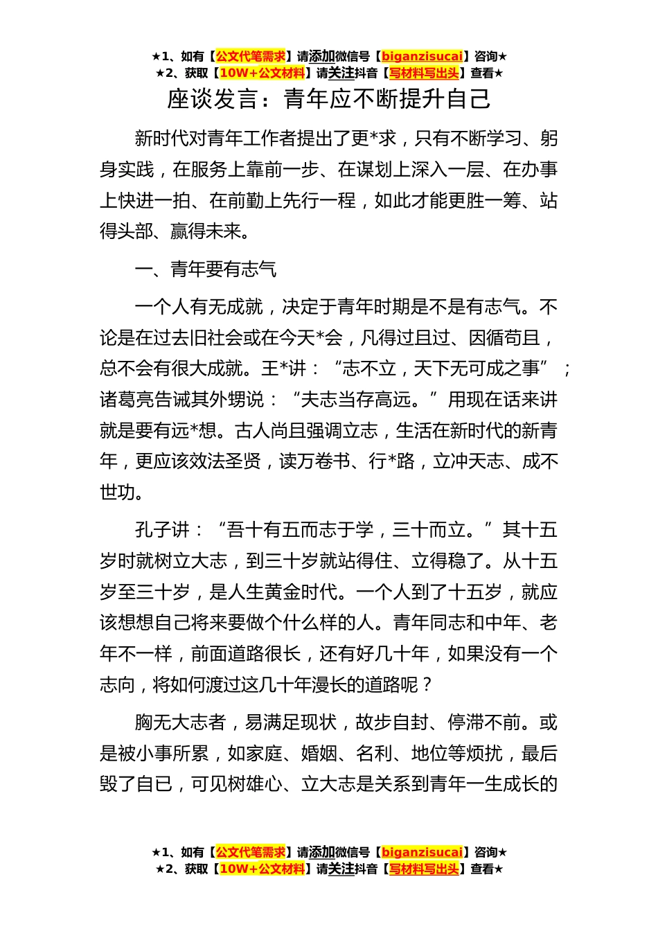★1、如有【公文代笔需求】请添加微信号【biganzisucai】咨询★★2、获取【10W+公文材料】请关注抖音【写材料写出头】查看★★1、如有【公文代笔需求】请添加微信号【biganzisucai】咨询★★2、获取【10W+公文材料】请关注抖音【写材料写出头】查看★★1、如有【公文代笔需求】请添加微信号【biganzisucai】咨询★★2、获取【10W+公文材料】请关注抖音【写材料写出头】查看★座谈发言:青年应不断提升自己新时代对青年工作者提出了更*求,只有不断学习、躬身实践,在服务上靠前一步、在谋划上深入一层、在办事上快进一拍、在前勤上先行一程,如此才能更胜一筹、站得头部、赢得未来。一、青年要有志气一个人有无成就,决定于青年时期是不是有志气。不论是在过去旧社会或在今天*会,凡得过且过、因循苟且,总不会有...