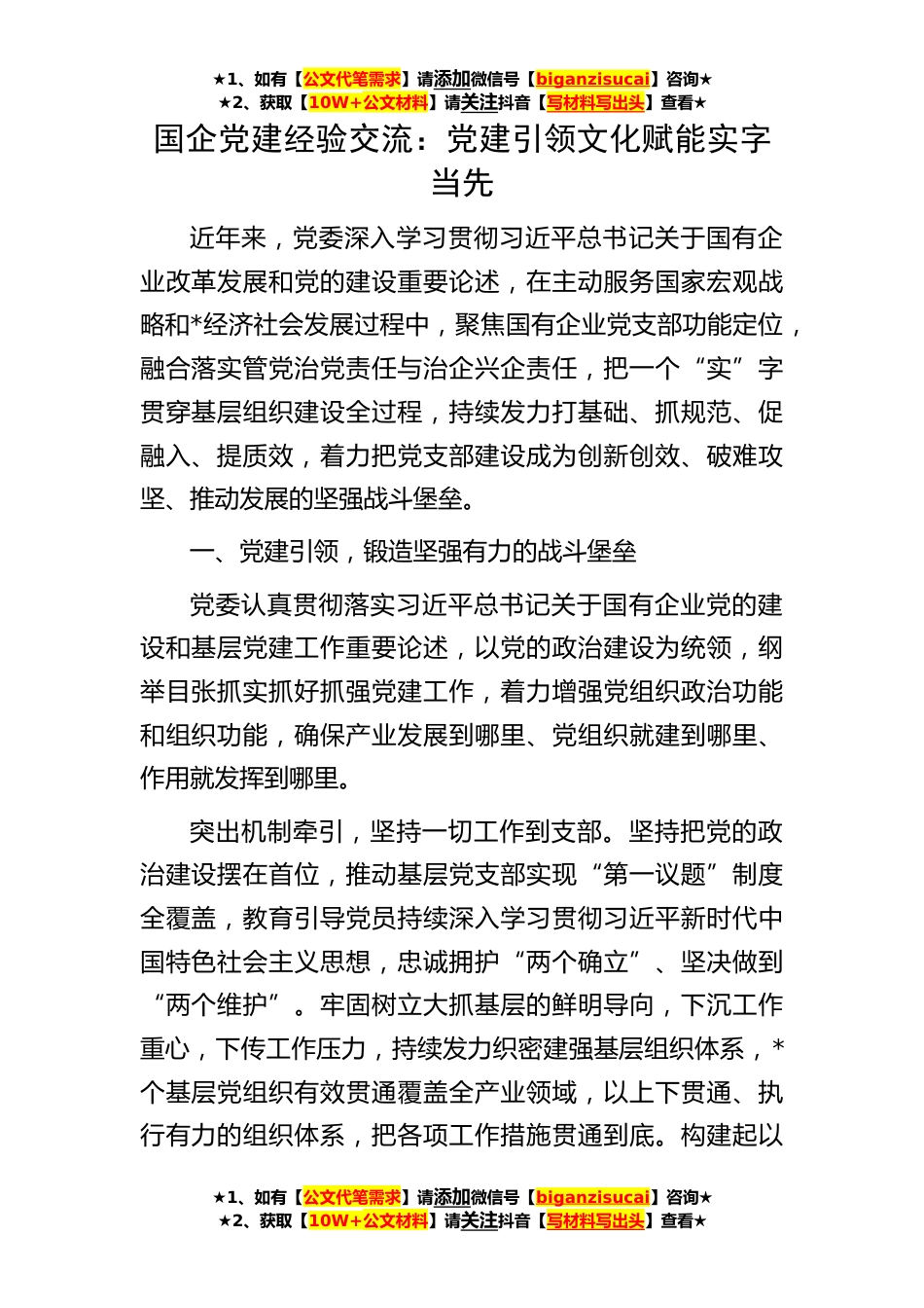 ★1、如有【公文代笔需求】请添加微信号【biganzisucai】咨询★★2、获取【10W+公文材料】请关注抖音【写材料写出头】查看★★1、如有【公文代笔需求】请添加微信号【biganzisucai】咨询★★2、获取【10W+公文材料】请关注抖音【写材料写出头】查看★★1、如有【公文代笔需求】请添加微信号【biganzisucai】咨询★★2、获取【10W+公文材料】请关注抖音【写材料写出头】查看★国企党建经验交流:党建引领文化赋能实字当先近年来,党委深入学习贯彻习近平总书记关于国有企业改革发展和党的建设重要论述,在主动服务国家宏观战略和*经济社会发展过程中,聚焦国有企业党支部功能定位,融合落实管党治党责任与治企兴企责任,把一个“实”字贯穿基层组织建设全过程,持续发力打基础、抓规范、促融入、提质效,着力把党支...