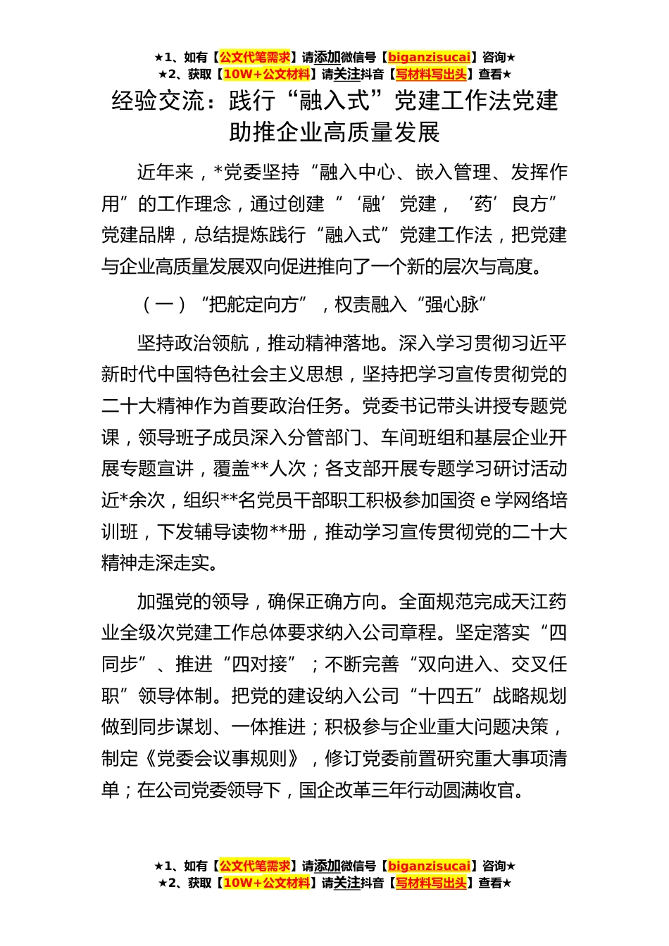 ★1、如有【公文代笔需求】请添加微信号【biganzisucai】咨询★★2、获取【10W+公文材料】请关注抖音【写材料写出头】查看★★1、如有【公文代笔需求】请添加微信号【biganzisucai】咨询★★2、获取【10W+公文材料】请关注抖音【写材料写出头】查看★★1、如有【公文代笔需求】请添加微信号【biganzisucai】咨询★★2、获取【10W+公文材料】请关注抖音【写材料写出头】查看★经验交流:践行“融入式”党建工作法党建助推企业高质量发展近年来,*党委坚持“融入中心、嵌入管理、发挥作用”的工作理念,通过创建“‘融’党建,‘药’良方”党建品牌,总结提炼践行“融入式”党建工作法,把党建与企业高质量发展双向促进推向了一个新的层次与高度。(一)“把舵定向方”,权责融入“强心脉”坚持政治领航,推动精神落...