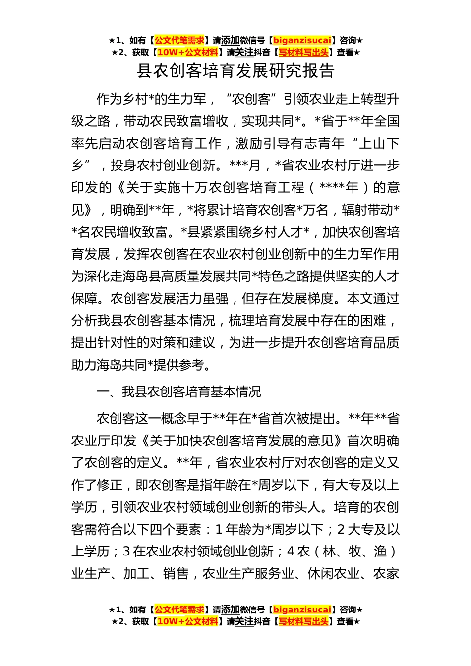 ★1、如有【公文代笔需求】请添加微信号【biganzisucai】咨询★★2、获取【10W+公文材料】请关注抖音【写材料写出头】查看★★1、如有【公文代笔需求】请添加微信号【biganzisucai】咨询★★2、获取【10W+公文材料】请关注抖音【写材料写出头】查看★★1、如有【公文代笔需求】请添加微信号【biganzisucai】咨询★★2、获取【10W+公文材料】请关注抖音【写材料写出头】查看★县农创客培育发展研究报告作为乡村*的生力军,“农创客”引领农业走上转型升级之路,带动农民致富增收,实现共同*。*省于**年全国率先启动农创客培育工作,激励引导有志青年“上山下乡”,投身农村创业创新。***月,*省农业农村厅进一步印发的《关于实施十万农创客培育工程(****年)的意见》,明确到**年,*将累计培育农创客*万名,辐射带...