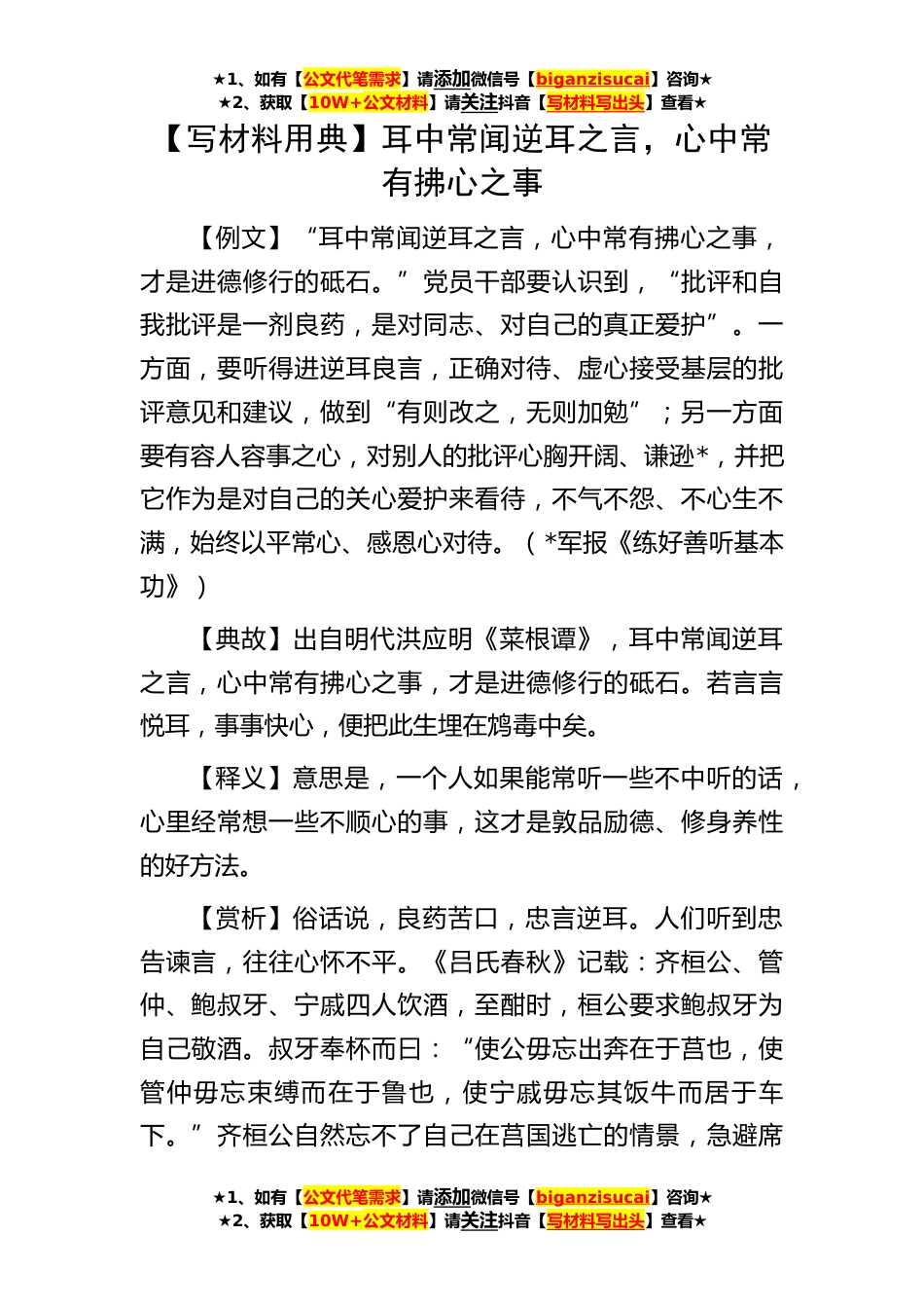 ★1、如有【公文代笔需求】请添加微信号【biganzisucai】咨询★★2、获取【10W+公文材料】请关注抖音【写材料写出头】查看★★1、如有【公文代笔需求】请添加微信号【biganzisucai】咨询★★2、获取【10W+公文材料】请关注抖音【写材料写出头】查看★★1、如有【公文代笔需求】请添加微信号【biganzisucai】咨询★★2、获取【10W+公文材料】请关注抖音【写材料写出头】查看★【写材料用典】耳中常闻逆耳之言,心中常有拂心之事【例文】“耳中常闻逆耳之言,心中常有拂心之事,才是进德修行的砥石。”党员干部要认识到,“批评和自我批评是一剂良药,是对同志、对自己的真正爱护”。一方面,要听得进逆耳良言,正确对待、虚心接受基层的批评意见和建议,做到“有则改之,无则加勉”;另一方面要有容人容事之心,对...