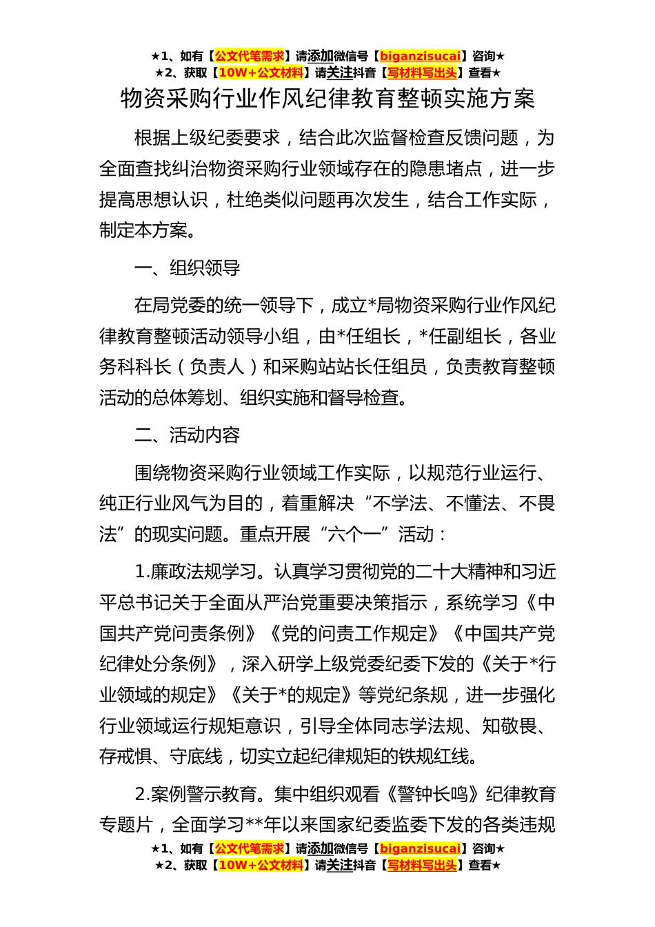 ★1、如有【公文代笔需求】请添加微信号【biganzisucai】咨询★★2、获取【10W+公文材料】请关注抖音【写材料写出头】查看★★1、如有【公文代笔需求】请添加微信号【biganzisucai】咨询★★2、获取【10W+公文材料】请关注抖音【写材料写出头】查看★★1、如有【公文代笔需求】请添加微信号【biganzisucai】咨询★★2、获取【10W+公文材料】请关注抖音【写材料写出头】查看★物资采购行业作风纪律教育整顿实施方案根据上级纪委要求,结合此次监督检查反馈问题,为全面查找纠治物资采购行业领域存在的隐患堵点,进一步提高思想认识,杜绝类似问题再次发生,结合工作实际,制定本方案。一、组织领导在局党委的统一领导下,成立*局物资采购行业作风纪律教育整顿活动领导小组,由*任组长,*任副组长,各业务科科长(负...