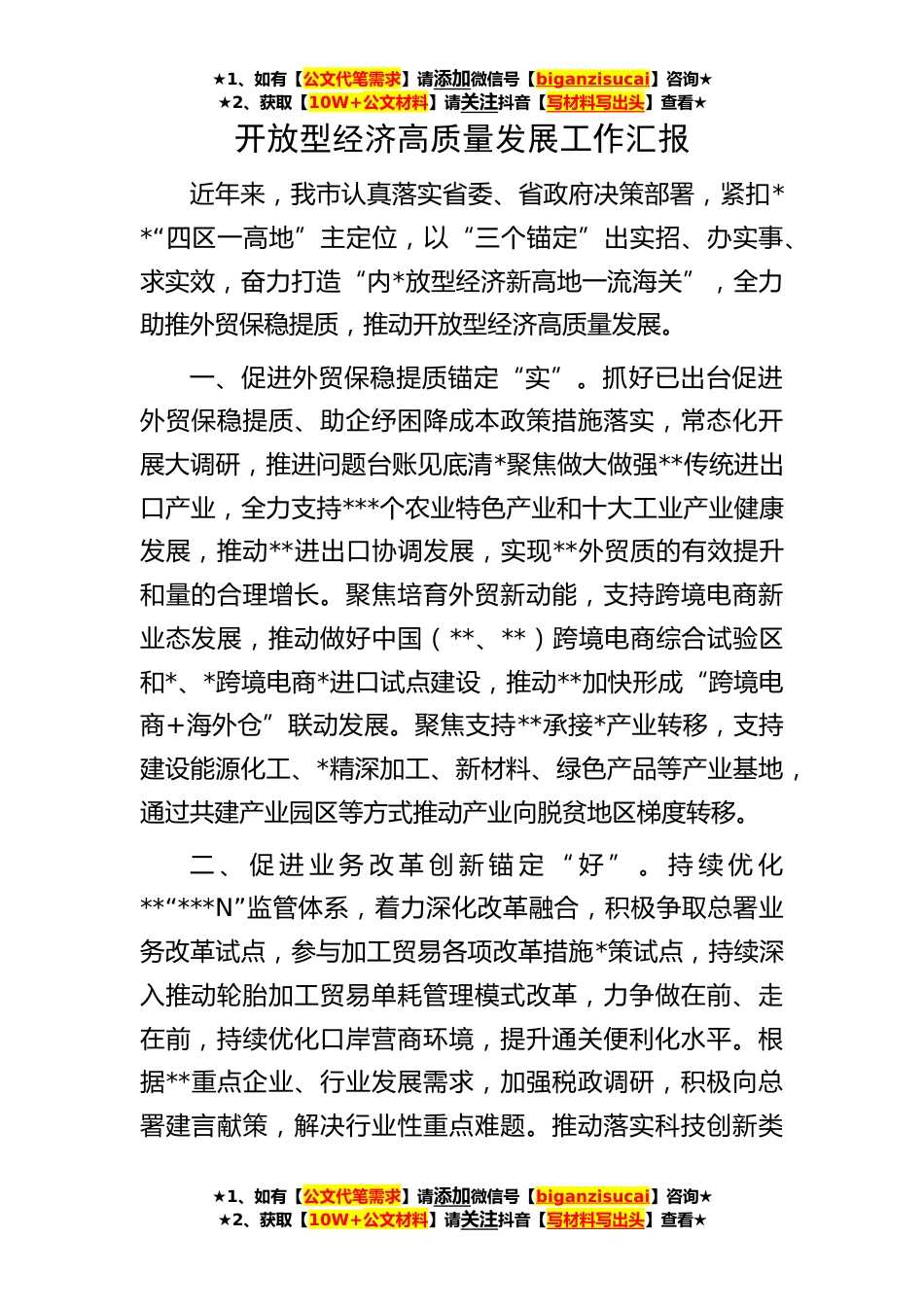 ★1、如有【公文代笔需求】请添加微信号【biganzisucai】咨询★★2、获取【10W+公文材料】请关注抖音【写材料写出头】查看★★1、如有【公文代笔需求】请添加微信号【biganzisucai】咨询★★2、获取【10W+公文材料】请关注抖音【写材料写出头】查看★★1、如有【公文代笔需求】请添加微信号【biganzisucai】咨询★★2、获取【10W+公文材料】请关注抖音【写材料写出头】查看★开放型经济高质量发展工作汇报近年来,我市认真落实省委、省政府决策部署,紧扣**“四区一高地”主定位,以“三个锚定”出实招、办实事、求实效,奋力打造“内*放型经济新高地一流海关”,全力助推外贸保稳提质,推动开放型经济高质量发展。一、促进外贸保稳提质锚定“实”。抓好已出台促进外贸保稳提质、助企纾困降成本政策措施落实,常态...