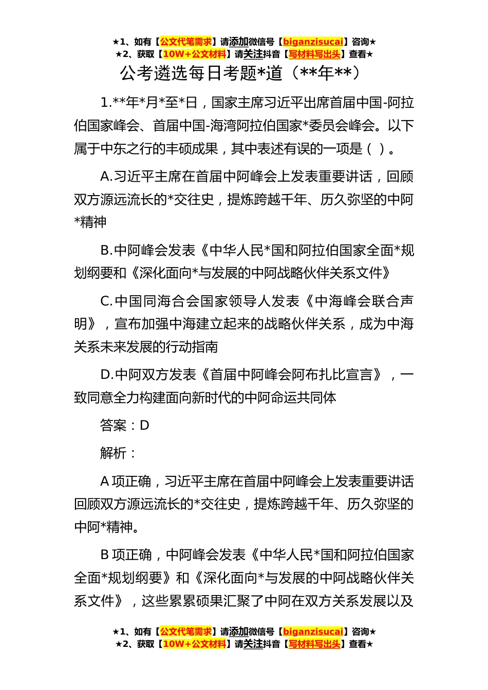 ★1、如有【公文代笔需求】请添加微信号【biganzisucai】咨询★★2、获取【10W+公文材料】请关注抖音【写材料写出头】查看★★1、如有【公文代笔需求】请添加微信号【biganzisucai】咨询★★2、获取【10W+公文材料】请关注抖音【写材料写出头】查看★★1、如有【公文代笔需求】请添加微信号【biganzisucai】咨询★★2、获取【10W+公文材料】请关注抖音【写材料写出头】查看★公考遴选每日考题*道(**年**)1.**年*月*至*日,国家主席习近平出席首届中国-阿拉伯国家峰会、首届中国-海湾阿拉伯国家*委员会峰会。以下属于中东之行的丰硕成果,其中表述有误的一项是()。A.习近平主席在首届中阿峰会上发表重要讲话,回顾双方源远流长的*交往史,提炼跨越千年、历久弥坚的中阿*精神B.中阿峰会发表《中华人民*国和阿拉...