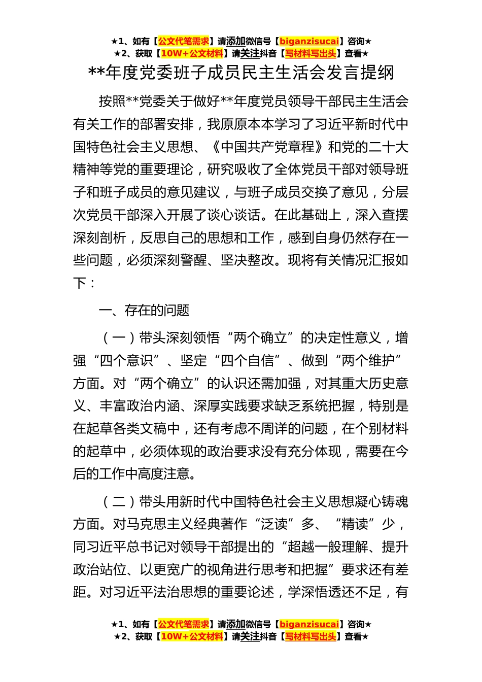 ★1、如有【公文代笔需求】请添加微信号【biganzisucai】咨询★★2、获取【10W+公文材料】请关注抖音【写材料写出头】查看★★1、如有【公文代笔需求】请添加微信号【biganzisucai】咨询★★2、获取【10W+公文材料】请关注抖音【写材料写出头】查看★★1、如有【公文代笔需求】请添加微信号【biganzisucai】咨询★★2、获取【10W+公文材料】请关注抖音【写材料写出头】查看★**年度党委班子成员民主生活会发言提纲按照**党委关于做好**年度党员领导干部民主生活会有关工作的部署安排,我原原本本学习了习近平新时代中国特色社会主义思想、《中国共产党章程》和党的二十大精神等党的重要理论,研究吸收了全体党员干部对领导班子和班子成员的意见建议,与班子成员交换了意见,分层次党员干部深入开展了谈心谈话。在...