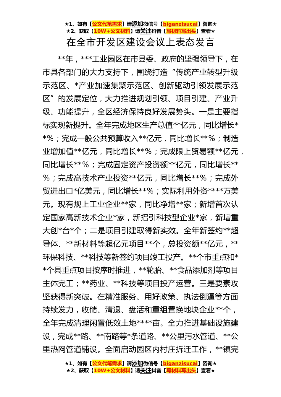 ★1、如有【公文代笔需求】请添加微信号【biganzisucai】咨询★★2、获取【10W+公文材料】请关注抖音【写材料写出头】查看★★1、如有【公文代笔需求】请添加微信号【biganzisucai】咨询★★2、获取【10W+公文材料】请关注抖音【写材料写出头】查看★★1、如有【公文代笔需求】请添加微信号【biganzisucai】咨询★★2、获取【10W+公文材料】请关注抖音【写材料写出头】查看★在全市开发区建设会议上表态发言**年,***工业园区在市县委、政府的坚强领导下,在市县各部门的大力支持下,围绕打造“传统产业转型升级示范区、*产业加速集聚示范区、创新驱动引领发展示范区”的发展定位,大力推进规划引领、项目引建、产业升级、功能提升,全区经济保持良好发展势头。一是主要指标实现新提升。全年完成地区生产总值**亿...