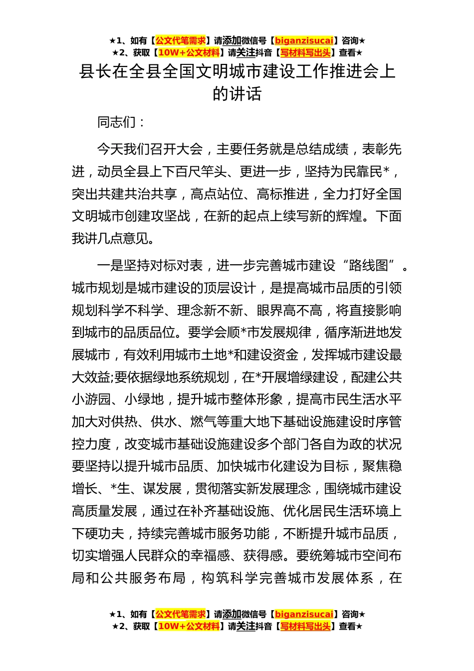 ★1、如有【公文代笔需求】请添加微信号【biganzisucai】咨询★★2、获取【10W+公文材料】请关注抖音【写材料写出头】查看★★1、如有【公文代笔需求】请添加微信号【biganzisucai】咨询★★2、获取【10W+公文材料】请关注抖音【写材料写出头】查看★★1、如有【公文代笔需求】请添加微信号【biganzisucai】咨询★★2、获取【10W+公文材料】请关注抖音【写材料写出头】查看★县长在全县全国文明城市建设工作推进会上的讲话同志们:今天我们召开大会,主要任务就是总结成绩,表彰先进,动员全县上下百尺竿头、更进一步,坚持为民靠民*,突出共建共治共享,高点站位、高标推进,全力打好全国文明城市创建攻坚战,在新的起点上续写新的辉煌。下面我讲几点意见。一是坚持对标对表,进一步完善城市建设“路线图”。城市...