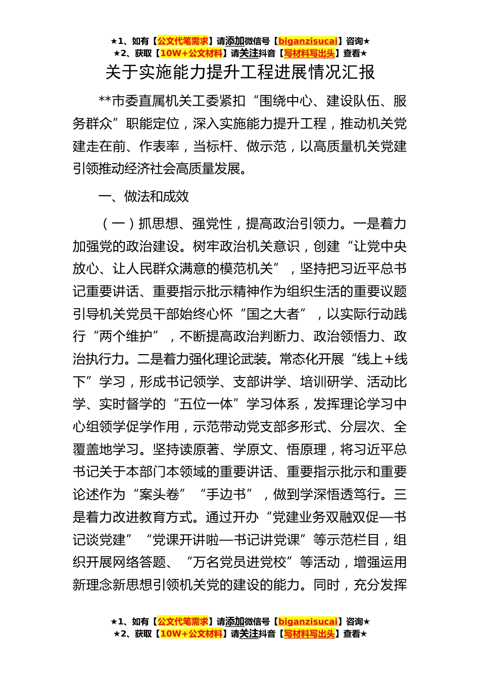 ★1、如有【公文代笔需求】请添加微信号【biganzisucai】咨询★★2、获取【10W+公文材料】请关注抖音【写材料写出头】查看★★1、如有【公文代笔需求】请添加微信号【biganzisucai】咨询★★2、获取【10W+公文材料】请关注抖音【写材料写出头】查看★★1、如有【公文代笔需求】请添加微信号【biganzisucai】咨询★★2、获取【10W+公文材料】请关注抖音【写材料写出头】查看★关于实施能力提升工程进展情况汇报**市委直属机关工委紧扣“围绕中心、建设队伍、服务群众”职能定位,深入实施能力提升工程,推动机关党建走在前、作表率,当标杆、做示范,以高质量机关党建引领推动经济社会高质量发展。一、做法和成效(一)抓思想、强党性,提高政治引领力。一是着力加强党的政治建设。树牢政治机关意识,创建“让党中...
