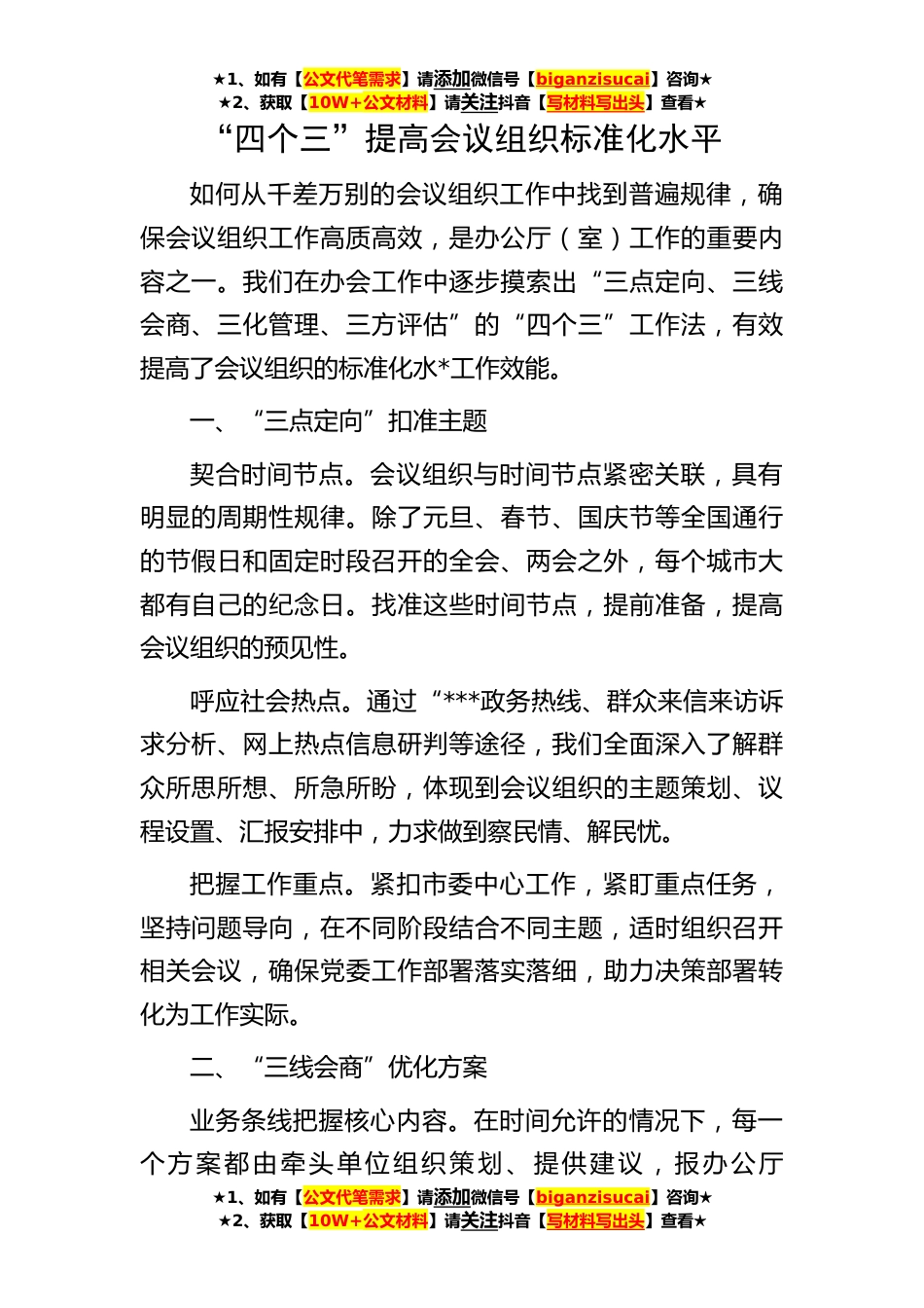 ★1、如有【公文代笔需求】请添加微信号【biganzisucai】咨询★★2、获取【10W+公文材料】请关注抖音【写材料写出头】查看★★1、如有【公文代笔需求】请添加微信号【biganzisucai】咨询★★2、获取【10W+公文材料】请关注抖音【写材料写出头】查看★★1、如有【公文代笔需求】请添加微信号【biganzisucai】咨询★★2、获取【10W+公文材料】请关注抖音【写材料写出头】查看★“四个三”提高会议组织标准化水平如何从千差万别的会议组织工作中找到普遍规律,确保会议组织工作高质高效,是办公厅(室)工作的重要内容之一。我们在办会工作中逐步摸索出“三点定向、三线会商、三化管理、三方评估”的“四个三”工作法,有效提高了会议组织的标准化水*工作效能。一、“三点定向”扣准主题契合时间节点。会议组织与时间...