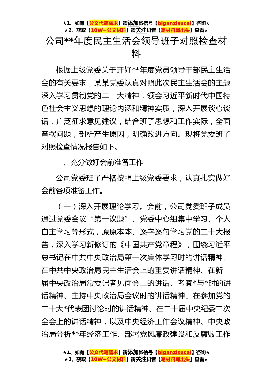 ★1、如有【公文代笔需求】请添加微信号【biganzisucai】咨询★★2、获取【10W+公文材料】请关注抖音【写材料写出头】查看★★1、如有【公文代笔需求】请添加微信号【biganzisucai】咨询★★2、获取【10W+公文材料】请关注抖音【写材料写出头】查看★★1、如有【公文代笔需求】请添加微信号【biganzisucai】咨询★★2、获取【10W+公文材料】请关注抖音【写材料写出头】查看★公司**年度民主生活会领导班子对照检查材料根据上级党委关于开好**年度党员领导干部民主生活会的有关要求,某某党委认真对照此次民主生活会的主题深入学习贯彻党的二十大精神,领会习近平新时代中国特色社会主义思想的理论内涵和精神实质,深入开展谈心谈话,广泛征求意见建议,结合班子思想和工作实际,全面查摆问题,剖析产生原因,明确...