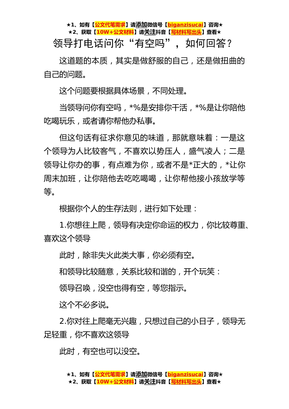 ★1、如有【公文代笔需求】请添加微信号【biganzisucai】咨询★★2、获取【10W+公文材料】请关注抖音【写材料写出头】查看★★1、如有【公文代笔需求】请添加微信号【biganzisucai】咨询★★2、获取【10W+公文材料】请关注抖音【写材料写出头】查看★★1、如有【公文代笔需求】请添加微信号【biganzisucai】咨询★★2、获取【10W+公文材料】请关注抖音【写材料写出头】查看★领导打电话问你“有空吗”,如何回答?这道题的本质,其实是做舒服的自己,还是做扭曲的自己的问题。这个问题要根据具体场景,不同处理。当领导问你有空吗,*%是安排你干活,*%是让你陪他吃喝玩乐,或者请你帮他办私事。但这句话有征求你意见的味道,那就意味着:一是这个领导为人比较客气,不喜欢以势压人,盛气凌人;二是领导让你办的事...