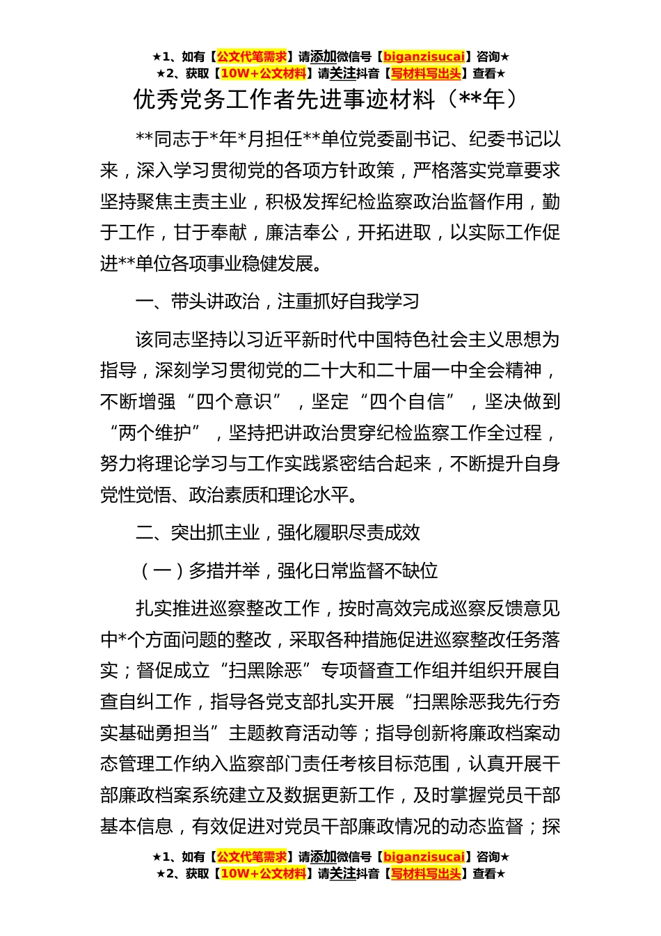 ★1、如有【公文代笔需求】请添加微信号【biganzisucai】咨询★★2、获取【10W+公文材料】请关注抖音【写材料写出头】查看★★1、如有【公文代笔需求】请添加微信号【biganzisucai】咨询★★2、获取【10W+公文材料】请关注抖音【写材料写出头】查看★★1、如有【公文代笔需求】请添加微信号【biganzisucai】咨询★★2、获取【10W+公文材料】请关注抖音【写材料写出头】查看★优秀党务工作者先进事迹材料(**年)**同志于*年*月担任**单位党委副书记、纪委书记以来,深入学习贯彻党的各项方针政策,严格落实党章要求坚持聚焦主责主业,积极发挥纪检监察政治监督作用,勤于工作,甘于奉献,廉洁奉公,开拓进取,以实际工作促进**单位各项事业稳健发展。一、带头讲政治,注重抓好自我学习该同志坚持以习近平新时代中...