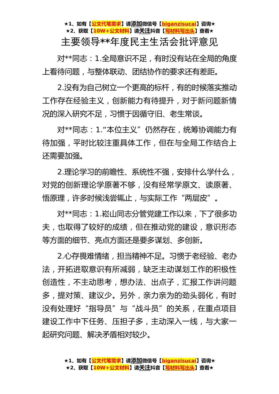 ★1、如有【公文代笔需求】请添加微信号【biganzisucai】咨询★★2、获取【10W+公文材料】请关注抖音【写材料写出头】查看★★1、如有【公文代笔需求】请添加微信号【biganzisucai】咨询★★2、获取【10W+公文材料】请关注抖音【写材料写出头】查看★★1、如有【公文代笔需求】请添加微信号【biganzisucai】咨询★★2、获取【10W+公文材料】请关注抖音【写材料写出头】查看★主要领导**年度民主生活会批评意见对**同志:1.全局意识不足,有时没有站在全局的角度上看待问题,与整体联动、团结协作的要求还有差距。2.没有为自己树立一个更高的标杆,有的时候落实推动工作存在经验主义,创新能力有待提升,对于新问题新情况的深入研究不足,习惯于因循守旧、老生常谈。对**同志:1.“本位主义”仍然存在,统筹协调能...
