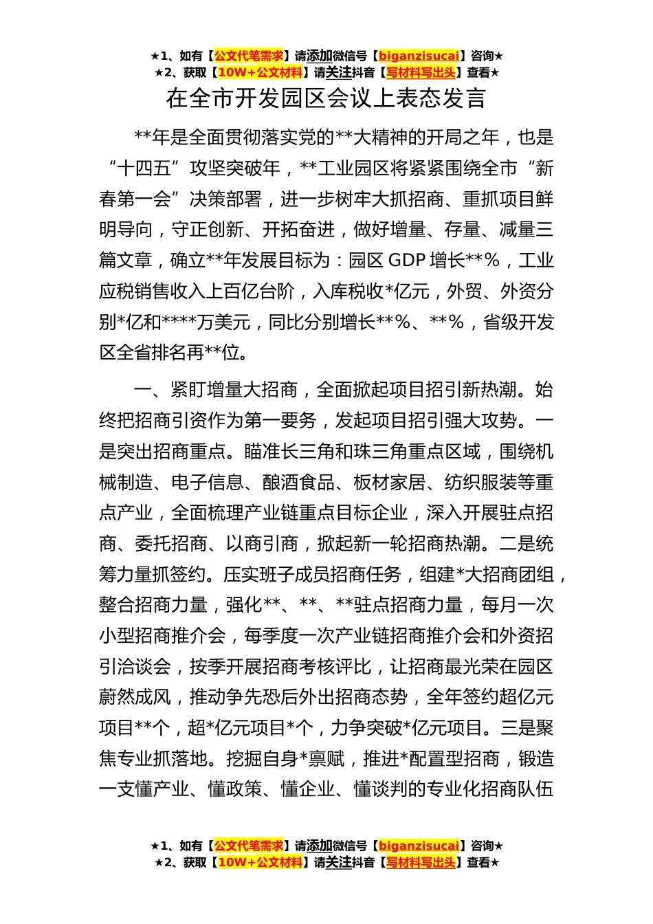 ★1、如有【公文代笔需求】请添加微信号【biganzisucai】咨询★★2、获取【10W+公文材料】请关注抖音【写材料写出头】查看★★1、如有【公文代笔需求】请添加微信号【biganzisucai】咨询★★2、获取【10W+公文材料】请关注抖音【写材料写出头】查看★★1、如有【公文代笔需求】请添加微信号【biganzisucai】咨询★★2、获取【10W+公文材料】请关注抖音【写材料写出头】查看★在全市开发园区会议上表态发言**年是全面贯彻落实党的**大精神的开局之年,也是“十四五”攻坚突破年,**工业园区将紧紧围绕全市“新春第一会”决策部署,进一步树牢大抓招商、重抓项目鲜明导向,守正创新、开拓奋进,做好增量、存量、减量三篇文章,确立**年发展目标为:园区GDP增长**%,工业应税销售收入上百亿台阶,入库税收*亿元,外...