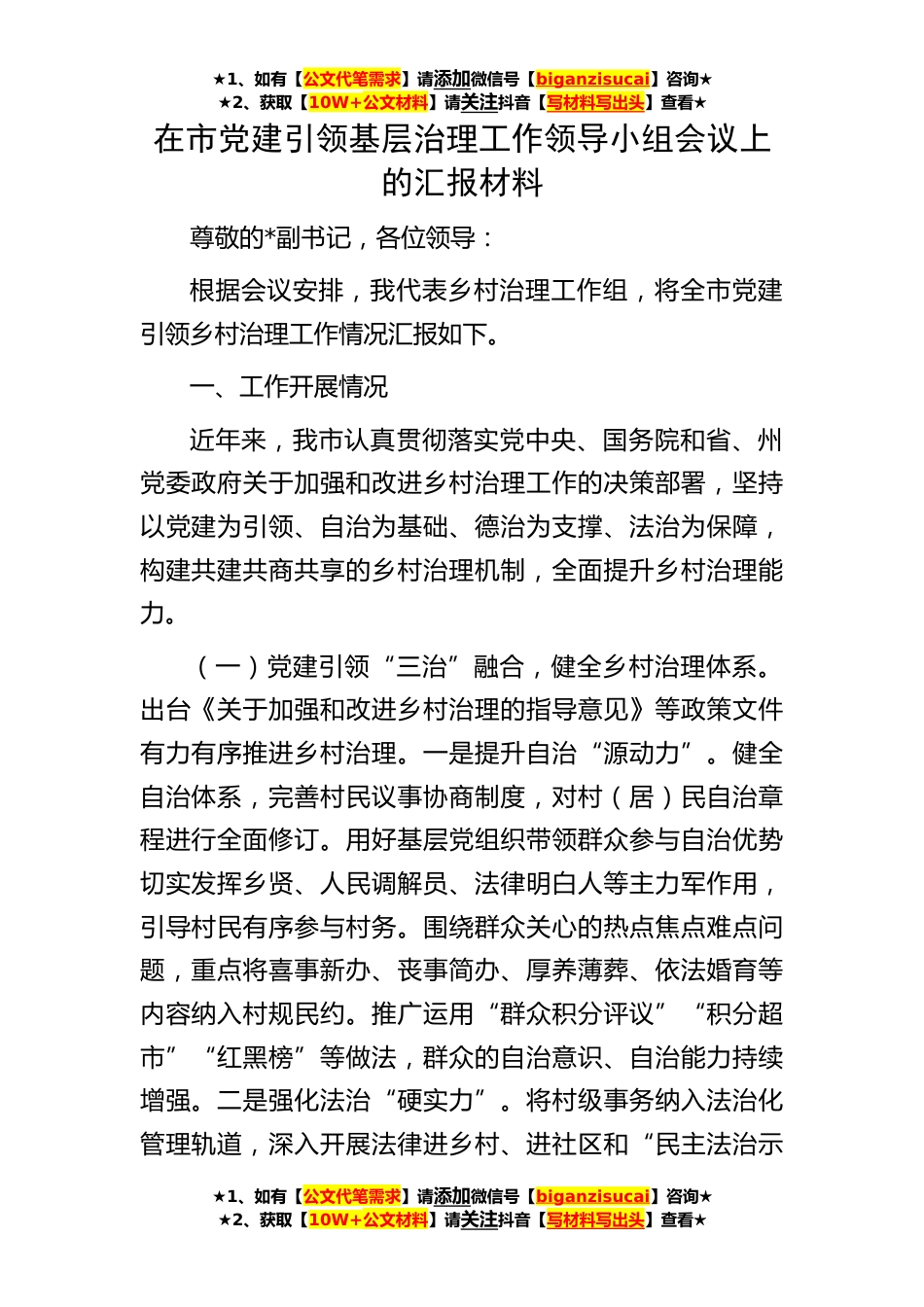 ★1、如有【公文代笔需求】请添加微信号【biganzisucai】咨询★★2、获取【10W+公文材料】请关注抖音【写材料写出头】查看★★1、如有【公文代笔需求】请添加微信号【biganzisucai】咨询★★2、获取【10W+公文材料】请关注抖音【写材料写出头】查看★★1、如有【公文代笔需求】请添加微信号【biganzisucai】咨询★★2、获取【10W+公文材料】请关注抖音【写材料写出头】查看★在市党建引领基层治理工作领导小组会议上的汇报材料尊敬的*副书记,各位领导:根据会议安排,我代表乡村治理工作组,将全市党建引领乡村治理工作情况汇报如下。一、工作开展情况近年来,我市认真贯彻落实党中央、国务院和省、州党委政府关于加强和改进乡村治理工作的决策部署,坚持以党建为引领、自治为基础、德治为支撑、法治为保障,构建...