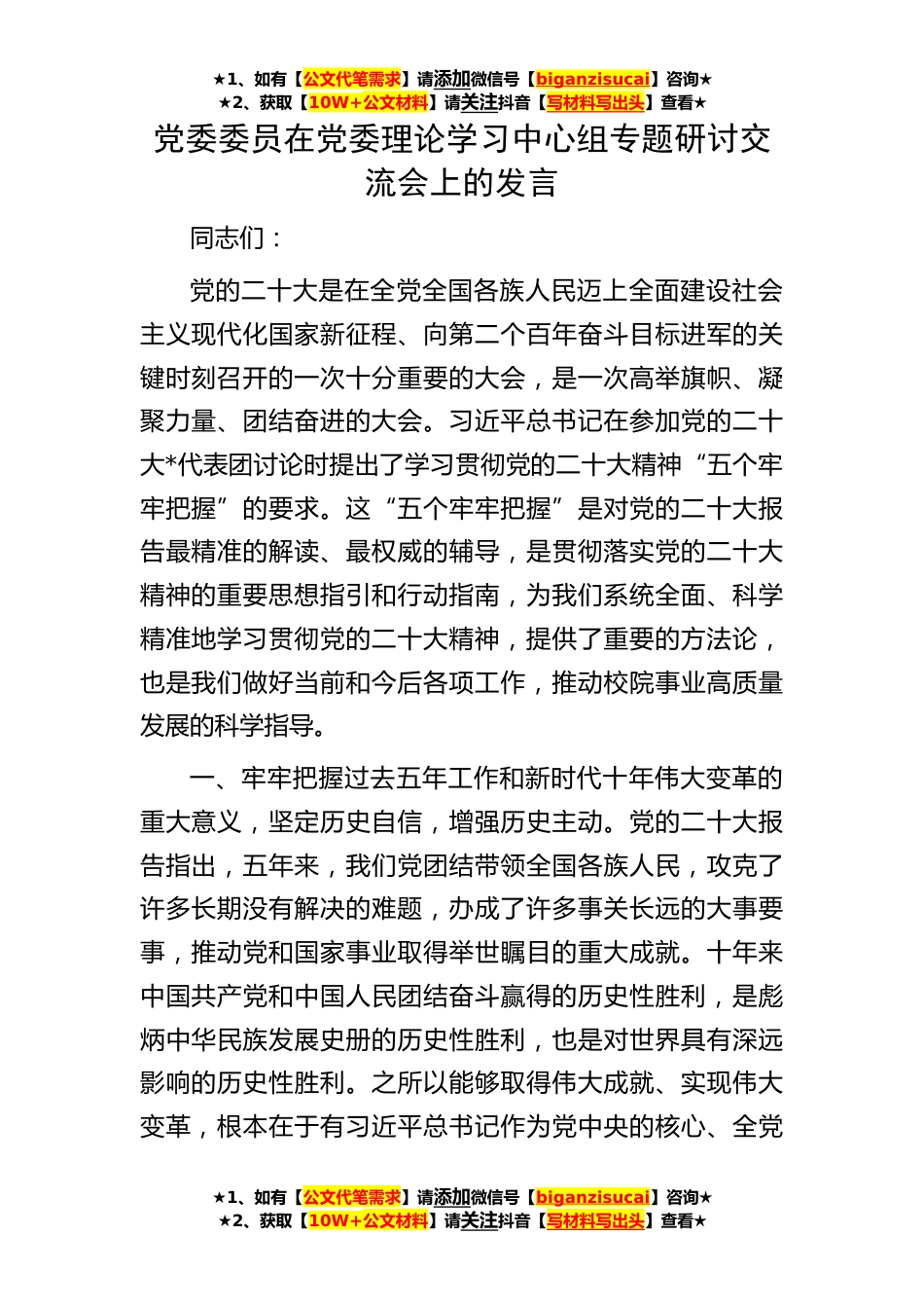 ★1、如有【公文代笔需求】请添加微信号【biganzisucai】咨询★★2、获取【10W+公文材料】请关注抖音【写材料写出头】查看★★1、如有【公文代笔需求】请添加微信号【biganzisucai】咨询★★2、获取【10W+公文材料】请关注抖音【写材料写出头】查看★★1、如有【公文代笔需求】请添加微信号【biganzisucai】咨询★★2、获取【10W+公文材料】请关注抖音【写材料写出头】查看★党委委员在党委理论学习中心组专题研讨交流会上的发言同志们:党的二十大是在全党全国各族人民迈上全面建设社会主义现代化国家新征程、向第二个百年奋斗目标进军的关键时刻召开的一次十分重要的大会,是一次高举旗帜、凝聚力量、团结奋进的大会。习近平总书记在参加党的二十大*代表团讨论时提出了学习贯彻党的二十大精神“五个牢牢把握”的...