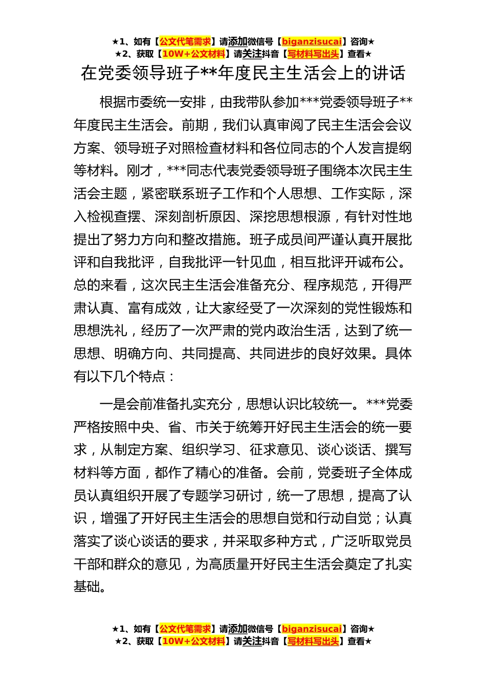 ★1、如有【公文代笔需求】请添加微信号【biganzisucai】咨询★★2、获取【10W+公文材料】请关注抖音【写材料写出头】查看★★1、如有【公文代笔需求】请添加微信号【biganzisucai】咨询★★2、获取【10W+公文材料】请关注抖音【写材料写出头】查看★★1、如有【公文代笔需求】请添加微信号【biganzisucai】咨询★★2、获取【10W+公文材料】请关注抖音【写材料写出头】查看★在党委领导班子**年度民主生活会上的讲话根据市委统一安排,由我带队参加***党委领导班子**年度民主生活会。前期,我们认真审阅了民主生活会会议方案、领导班子对照检查材料和各位同志的个人发言提纲等材料。刚才,***同志代表党委领导班子围绕本次民主生活会主题,紧密联系班子工作和个人思想、工作实际,深入检视查摆、深刻剖析原因、深...