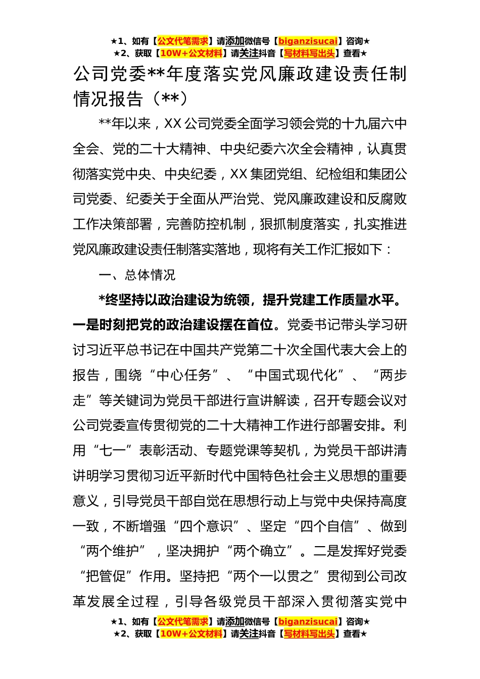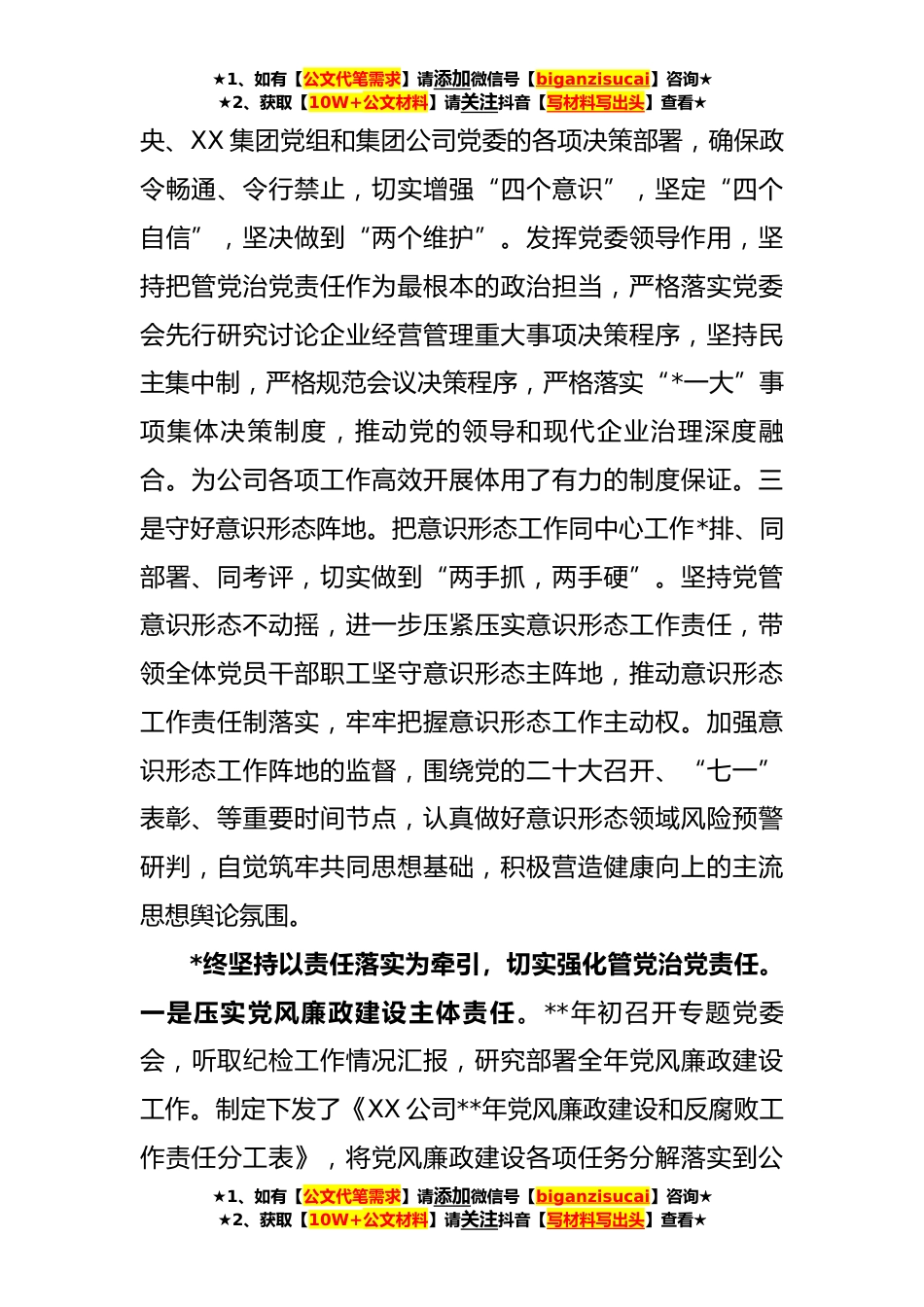 ★1、如有【公文代笔需求】请添加微信号【biganzisucai】咨询★★2、获取【10W+公文材料】请关注抖音【写材料写出头】查看★公司党委**年度落实党风廉政建设责任制情况报告(**)**年以来,XX公司党委全面学习领会党的十九届六中全会、党的二十大精神、中央纪委六次全会精神,认真贯彻落实党中央、中央纪委,XX集团党组、纪检组和集团公司党委、纪委关于全面从严治党、党风廉政建设和反腐败工作决策部署,完善防控机制,狠抓制度落实,扎实推进党风廉政建设责任制落实落地,现将有关工作汇报如下:一、总体情况*终坚持以政治建设为统领,提升党建工作质量水平。一是时刻把党的政治建设摆在首位。党委书记带头学习研讨习近平总书记在中国共产党第二十次全国代表大会上的报告,围绕“中心任务”、“中国式现代化”、...