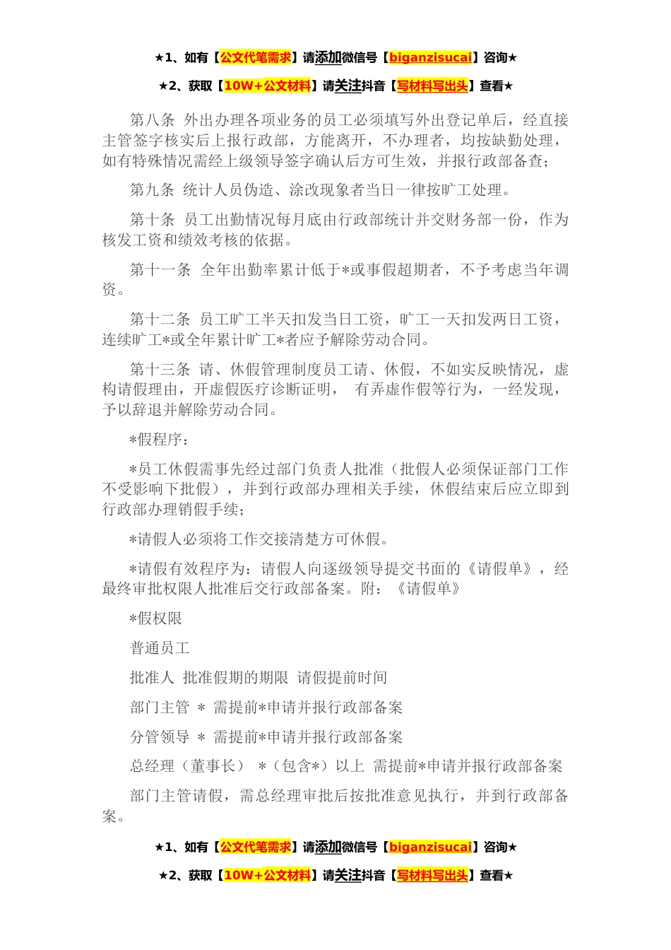 ★1、如有【公文代笔需求】请添加微信号【biganzisucai】咨询★★2、获取【10W+公文材料】请关注抖音【写材料写出头】查看★第一条为了加强公司考勤管理,督促员工养成自觉遵守纪律的好习惯,保证各项工作的正常开展,特制定本考勤制度。第二条本制度适用于公司全体员工。第三条公司员工除下列人员外,均应按规定上下班时间签到(打卡):1、因公出差人员。2、因故请假的人员。3、临时事务,事后以文字形式说明事由经主管签字核准,将书面文件交予行政部存档、备查(注:必须当天或次日补上书面说明)。第四条上下班时间为上午:***:*,下午*:**:*;具体公休时间以公司排班为准,(注:下属机构工作时间以当地为准)。第五条公司员工一律实行上下班打卡、登记制度,当月考勤截止日期为每月底;每日出勤规定打卡...