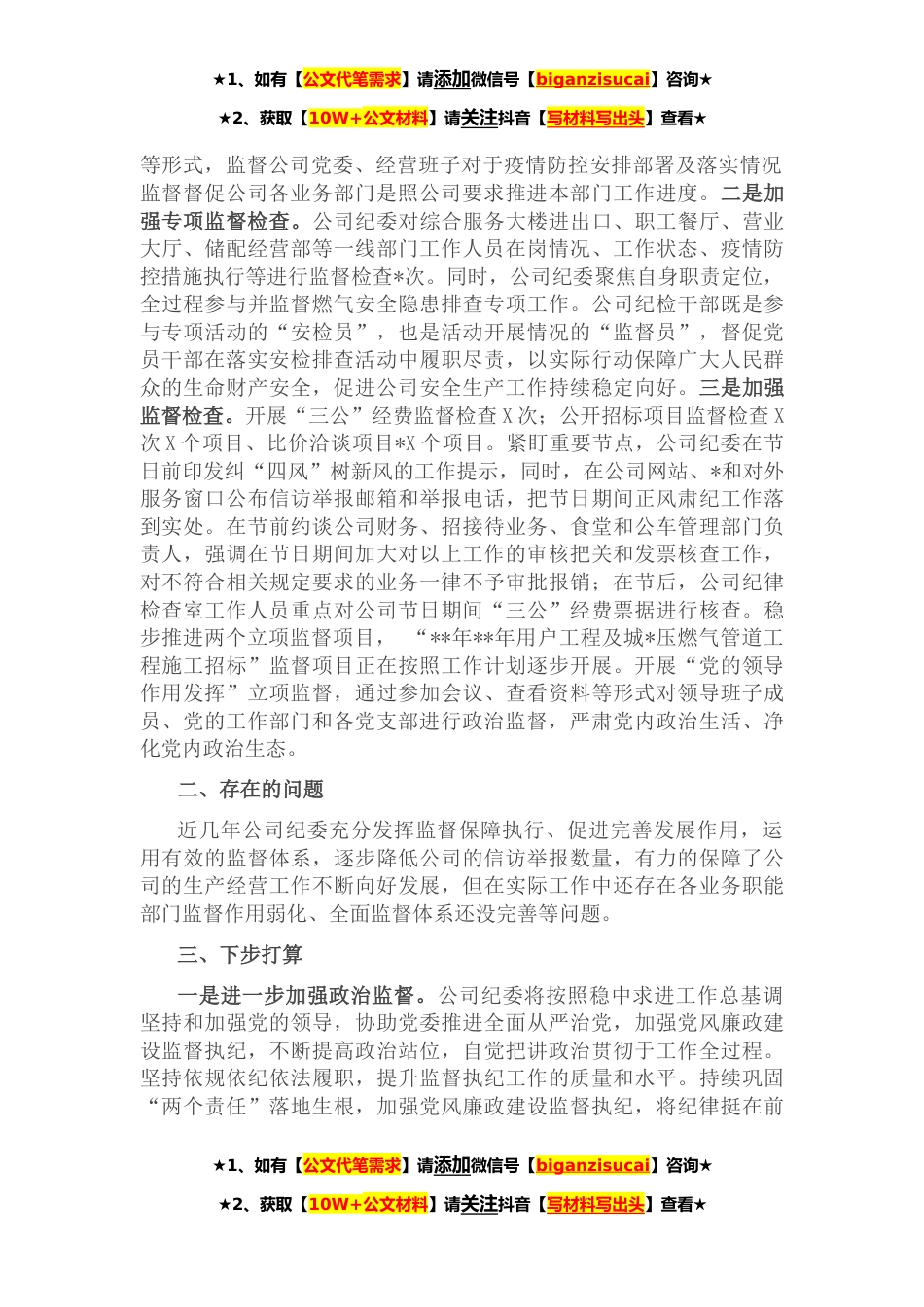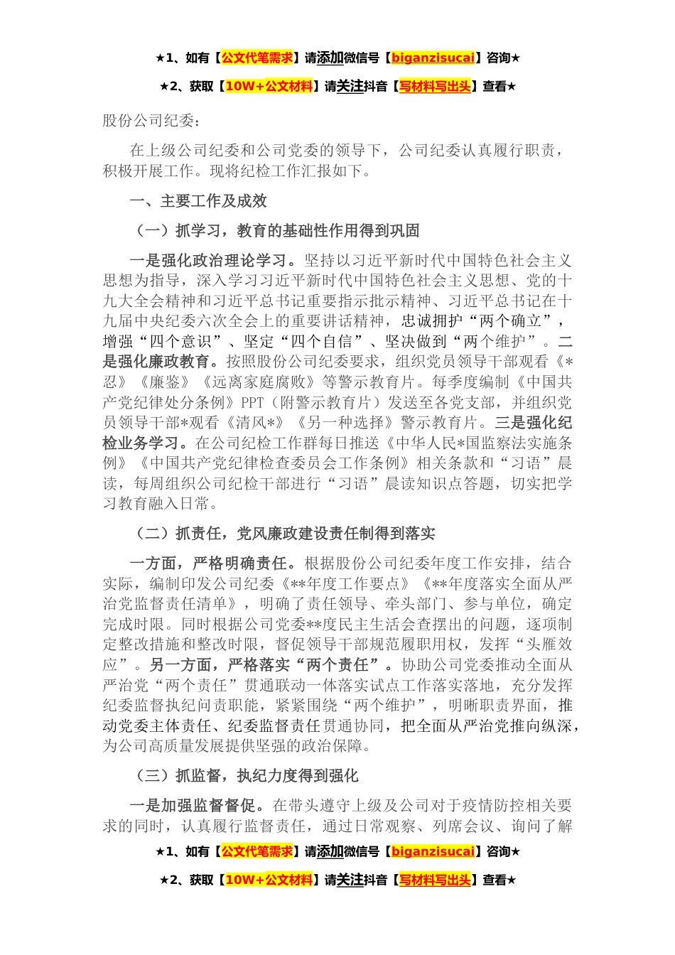 ★1、如有【公文代笔需求】请添加微信号【biganzisucai】咨询★★2、获取【10W+公文材料】请关注抖音【写材料写出头】查看★股份公司纪委:在上级公司纪委和公司党委的领导下,公司纪委认真履行职责,积极开展工作。现将纪检工作汇报如下。一、主要工作及成效(一)抓学习,教育的基础性作用得到巩固一是强化政治理论学习。坚持以习近平新时代中国特色社会主义思想为指导,深入学习习近平新时代中国特色社会主义思想、党的十九大全会精神和习近平总书记重要指示批示精神、习近平总书记在十九届中央纪委六次全会上的重要讲话精神,忠诚拥护“两个确立”,增强“四个意识”、坚定“四个自信”、坚决做到“两个维护”。二是强化廉政教育。按照股份公司纪委要求,组织党员领导干部观看《*忍》《廉鉴》《远离家庭腐败》...