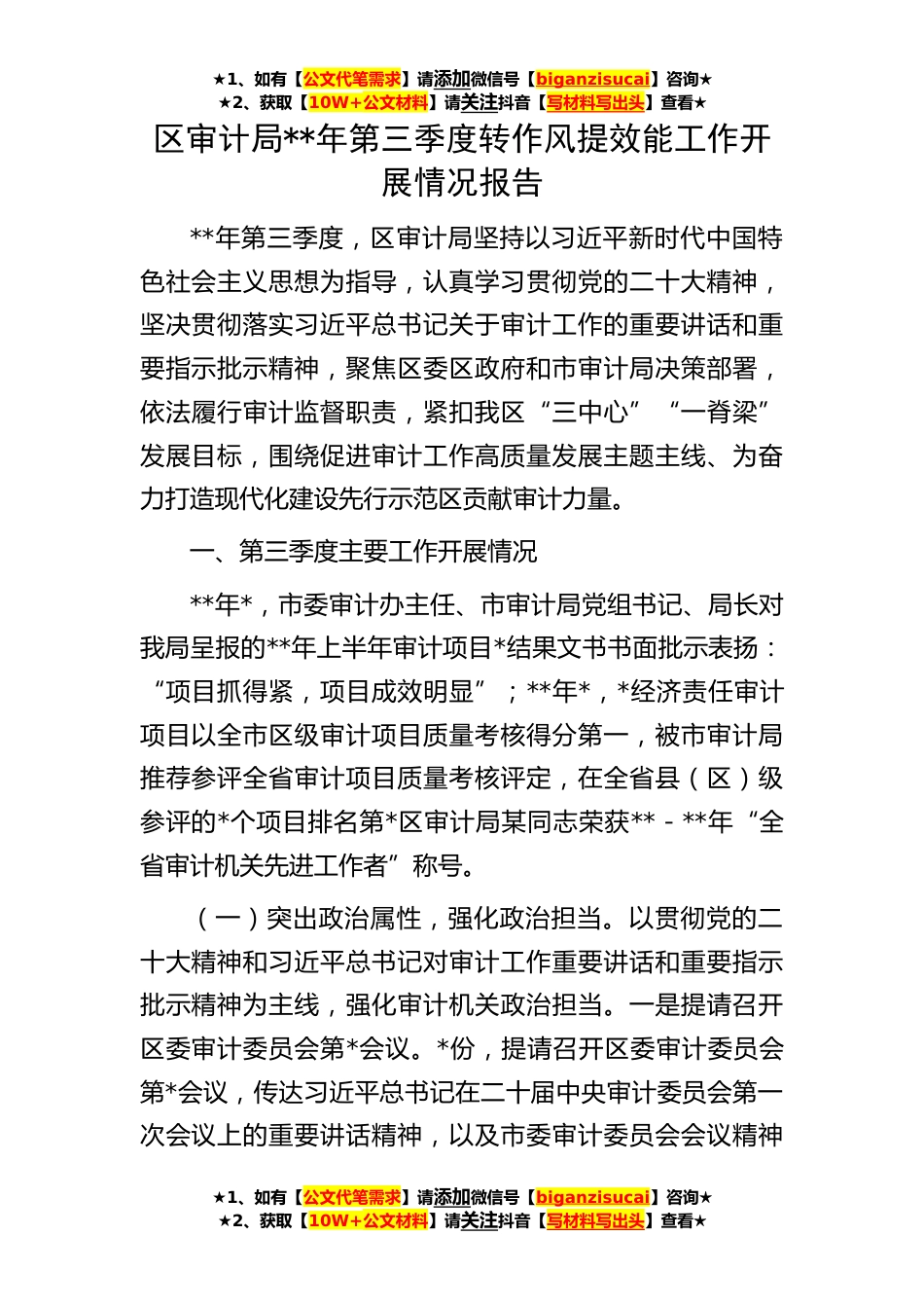 ★1、如有【公文代笔需求】请添加微信号【biganzisucai】咨询★★2、获取【10W+公文材料】请关注抖音【写材料写出头】查看★★1、如有【公文代笔需求】请添加微信号【biganzisucai】咨询★★2、获取【10W+公文材料】请关注抖音【写材料写出头】查看★★1、如有【公文代笔需求】请添加微信号【biganzisucai】咨询★★2、获取【10W+公文材料】请关注抖音【写材料写出头】查看★区审计局**年第三季度转作风提效能工作开展情况报告**年第三季度,区审计局坚持以习近平新时代中国特色社会主义思想为指导,认真学习贯彻党的二十大精神,坚决贯彻落实习近平总书记关于审计工作的重要讲话和重要指示批示精神,聚焦区委区政府和市审计局决策部署,依法履行审计监督职责,紧扣我区“三中心”“一脊梁”发展目标,围绕促进审...