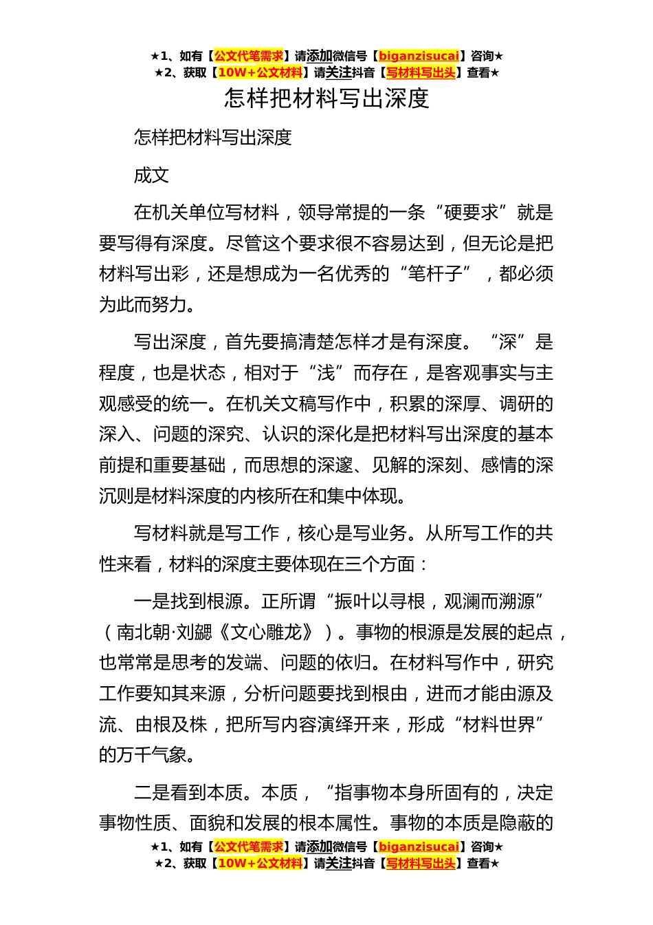 ★1、如有【公文代笔需求】请添加微信号【biganzisucai】咨询★★2、获取【10W+公文材料】请关注抖音【写材料写出头】查看★★1、如有【公文代笔需求】请添加微信号【biganzisucai】咨询★★2、获取【10W+公文材料】请关注抖音【写材料写出头】查看★★1、如有【公文代笔需求】请添加微信号【biganzisucai】咨询★★2、获取【10W+公文材料】请关注抖音【写材料写出头】查看★怎样把材料写出深度怎样把材料写出深度成文在机关单位写材料,领导常提的一条“硬要求”就是要写得有深度。尽管这个要求很不容易达到,但无论是把材料写出彩,还是想成为一名优秀的“笔杆子”,都必须为此而努力。写出深度,首先要搞清楚怎样才是有深度。“深”是程度,也是状态,相对于“浅”而存在,是客观事实与主观感受的统一。在机关...