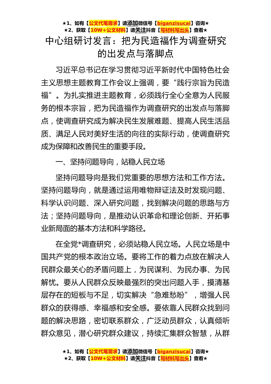 ★1、如有【公文代笔需求】请添加微信号【biganzisucai】咨询★★2、获取【10W+公文材料】请关注抖音【写材料写出头】查看★★1、如有【公文代笔需求】请添加微信号【biganzisucai】咨询★★2、获取【10W+公文材料】请关注抖音【写材料写出头】查看★★1、如有【公文代笔需求】请添加微信号【biganzisucai】咨询★★2、获取【10W+公文材料】请关注抖音【写材料写出头】查看★中心组研讨发言:把为民造福作为调查研究的出发点与落脚点习近平总书记在学习贯彻习近平新时代中国特色社会主义思想主题教育工作会议上强调,要“践行宗旨为民造福”。为扎实推进主题教育,必须践行全心全意为人民服务的根本宗旨,把为民造福作为调查研究的出发点与落脚点,使调查研究成为解决民生发展难题、提高人民生活品质、满足人民对...