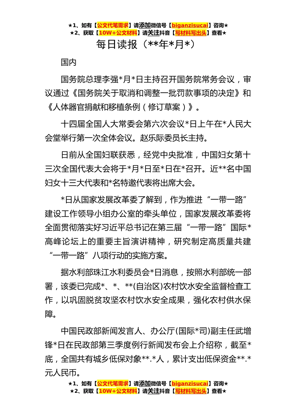 ★1、如有【公文代笔需求】请添加微信号【biganzisucai】咨询★★2、获取【10W+公文材料】请关注抖音【写材料写出头】查看★★1、如有【公文代笔需求】请添加微信号【biganzisucai】咨询★★2、获取【10W+公文材料】请关注抖音【写材料写出头】查看★★1、如有【公文代笔需求】请添加微信号【biganzisucai】咨询★★2、获取【10W+公文材料】请关注抖音【写材料写出头】查看★每日读报(**年*月*)国内国务院总理李强*月*日主持召开国务院常务会议,审议通过《国务院关于取消和调整一批罚款事项的决定》和《人体器官捐献和移植条例(修订草案)》。十四届全国人大常委会第六次会议*日上午在*人民大会堂举行第一次全体会议。赵乐际委员长主持。日前从全国妇联获悉,经党中央批准,中国妇女第十三次全国代表大会将于*...
