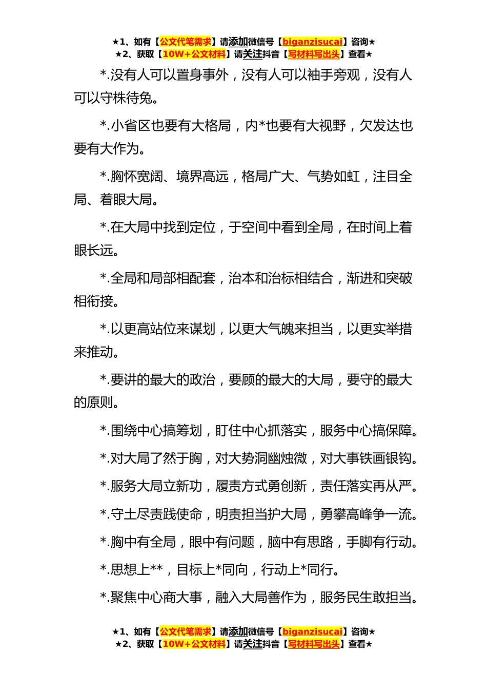 ★1、如有【公文代笔需求】请添加微信号【biganzisucai】咨询★★2、获取【10W+公文材料】请关注抖音【写材料写出头】查看★排比句*例(**年*月*)1唯有高标定位方能赢得大局,唯有改革创新方能抢占先机,唯有尽心竭力方能不辱使命,唯有团结拼搏方能成就事业2关系“国之大者”的重大政治责任,关系“省之大计”的重大战略任务,关系“民之大事”的重*会问题。3以“国之大者”的担当主动作为,以“省之头雁”的自觉探路先行,以“关键一招”的定位争创一流。4在目标追求上有大气魄,在管理制度上有大突破,在眼界胸怀上有大格局,在社会责任上有大担当。5自觉站位“国之大局”,始终对标“国之大者”,主动推进“国之大事”,倾力服务“国之大计”。6国家大局所需我们“该为”,*优势所具我们“应干”,发展基础所...