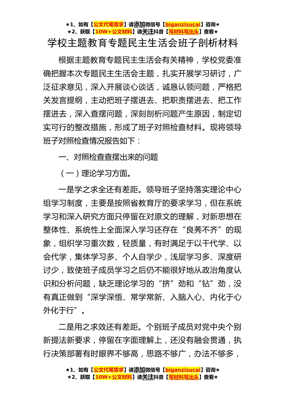★1、如有【公文代笔需求】请添加微信号【biganzisucai】咨询★★2、获取【10W+公文材料】请关注抖音【写材料写出头】查看★★1、如有【公文代笔需求】请添加微信号【biganzisucai】咨询★★2、获取【10W+公文材料】请关注抖音【写材料写出头】查看★★1、如有【公文代笔需求】请添加微信号【biganzisucai】咨询★★2、获取【10W+公文材料】请关注抖音【写材料写出头】查看★学校主题教育专题民主生活会班子剖析材料根据主题教育专题民主生活会有关精神,学校党委准确把握本次专题民主生活会主题,扎实开展学习研讨,广泛征求意见,深入开展谈心谈话,诚恳认领问题,严格把关发言提纲,主动把班子摆进去、把职责摆进去、把工作摆进去,深入查摆问题,深刻剖析问题产生原因,制定切实可行的整改措施,形成了班子对...