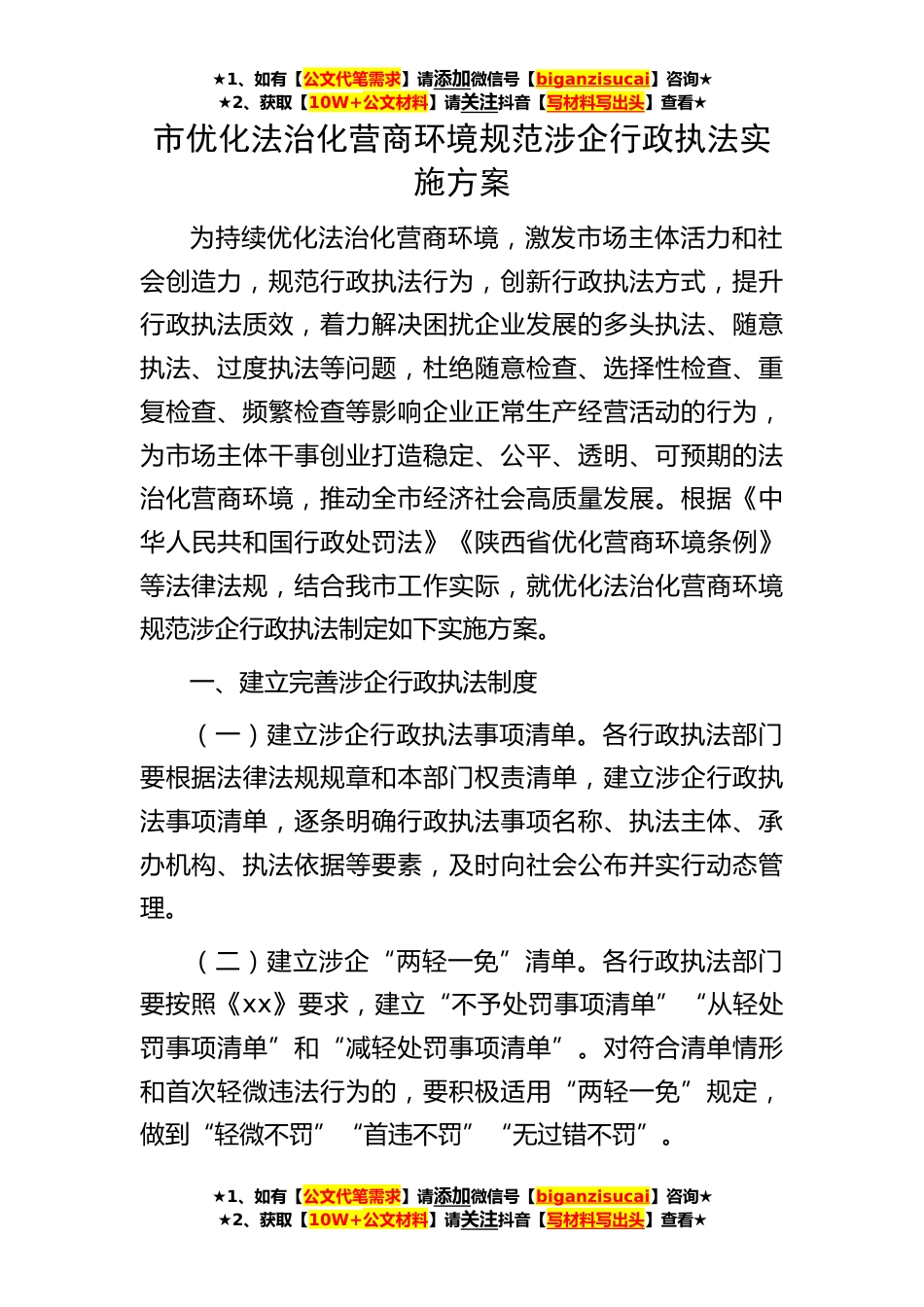 ★1、如有【公文代笔需求】请添加微信号【biganzisucai】咨询★★2、获取【10W+公文材料】请关注抖音【写材料写出头】查看★★1、如有【公文代笔需求】请添加微信号【biganzisucai】咨询★★2、获取【10W+公文材料】请关注抖音【写材料写出头】查看★★1、如有【公文代笔需求】请添加微信号【biganzisucai】咨询★★2、获取【10W+公文材料】请关注抖音【写材料写出头】查看★市优化法治化营商环境规范涉企行政执法实施方案为持续优化法治化营商环境,激发市场主体活力和社会创造力,规范行政执法行为,创新行政执法方式,提升行政执法质效,着力解决困扰企业发展的多头执法、随意执法、过度执法等问题,杜绝随意检查、选择性检查、重复检查、频繁检查等影响企业正常生产经营活动的行为,为市场主体干事创业打造稳...