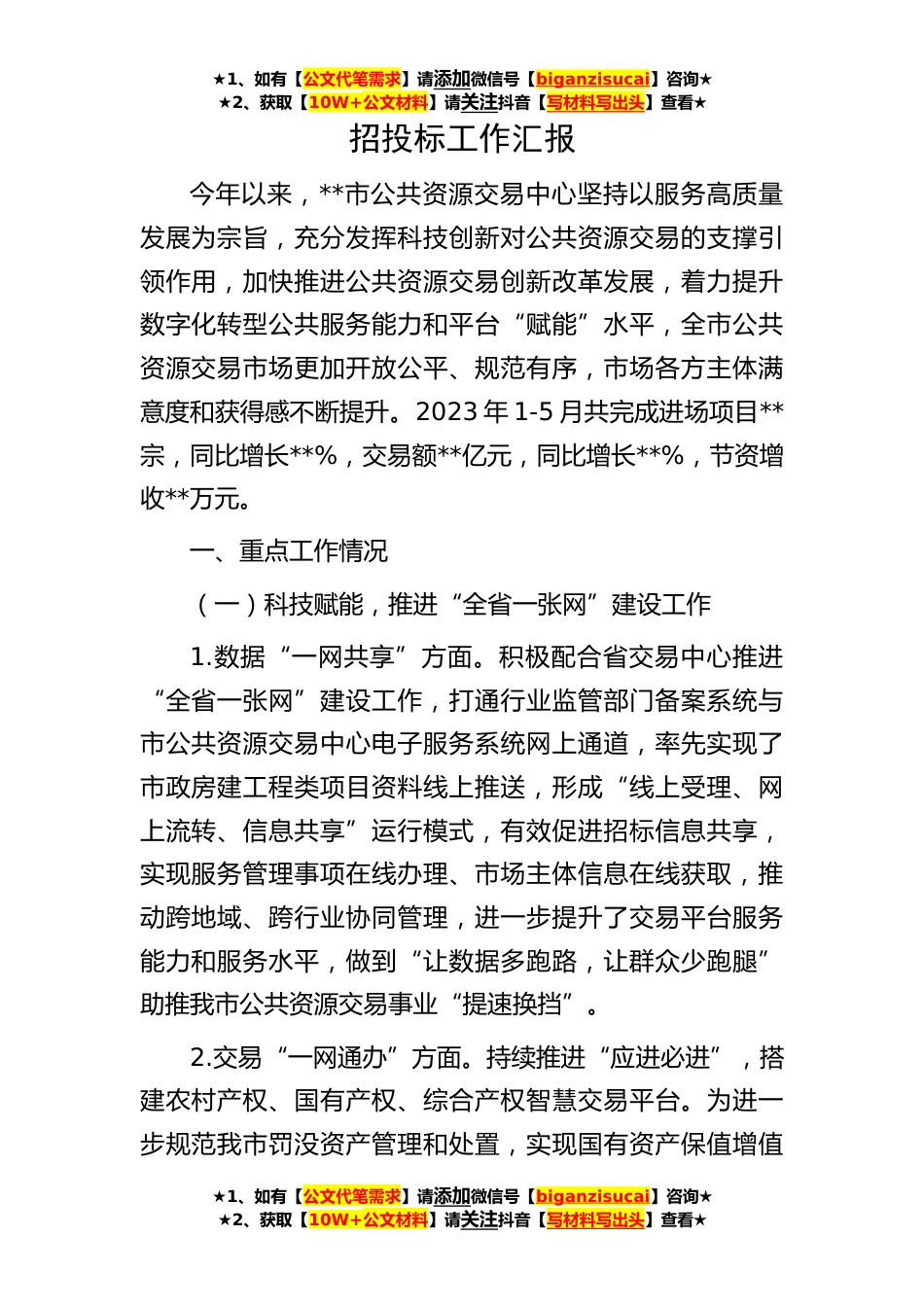 ★1、如有【公文代笔需求】请添加微信号【biganzisucai】咨询★★2、获取【10W+公文材料】请关注抖音【写材料写出头】查看★★1、如有【公文代笔需求】请添加微信号【biganzisucai】咨询★★2、获取【10W+公文材料】请关注抖音【写材料写出头】查看★★1、如有【公文代笔需求】请添加微信号【biganzisucai】咨询★★2、获取【10W+公文材料】请关注抖音【写材料写出头】查看★招投标工作汇报今年以来,**市公共资源交易中心坚持以服务高质量发展为宗旨,充分发挥科技创新对公共资源交易的支撑引领作用,加快推进公共资源交易创新改革发展,着力提升数字化转型公共服务能力和平台“赋能”水平,全市公共资源交易市场更加开放公平、规范有序,市场各方主体满意度和获得感不断提升。2023年1-5月共完成进场项目**宗,同...