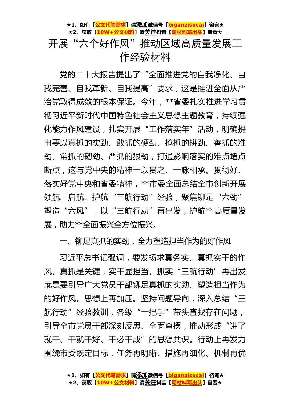 ★1、如有【公文代笔需求】请添加微信号【biganzisucai】咨询★★2、获取【10W+公文材料】请关注抖音【写材料写出头】查看★★1、如有【公文代笔需求】请添加微信号【biganzisucai】咨询★★2、获取【10W+公文材料】请关注抖音【写材料写出头】查看★★1、如有【公文代笔需求】请添加微信号【biganzisucai】咨询★★2、获取【10W+公文材料】请关注抖音【写材料写出头】查看★开展“六个好作风”推动区域高质量发展工作经验材料党的二十大报告提出了“全面推进党的自我净化、自我完善、自我革新、自我提高”要求,这是推进全面从严治党取得成效的根本保证。今年,**省委扎实推进学习贯彻习近平新时代中国特色社会主义思想主题教育,持续强化能力作风建设,扎实开展“工作落实年”活动,明确提出要以真抓的实劲、敢...