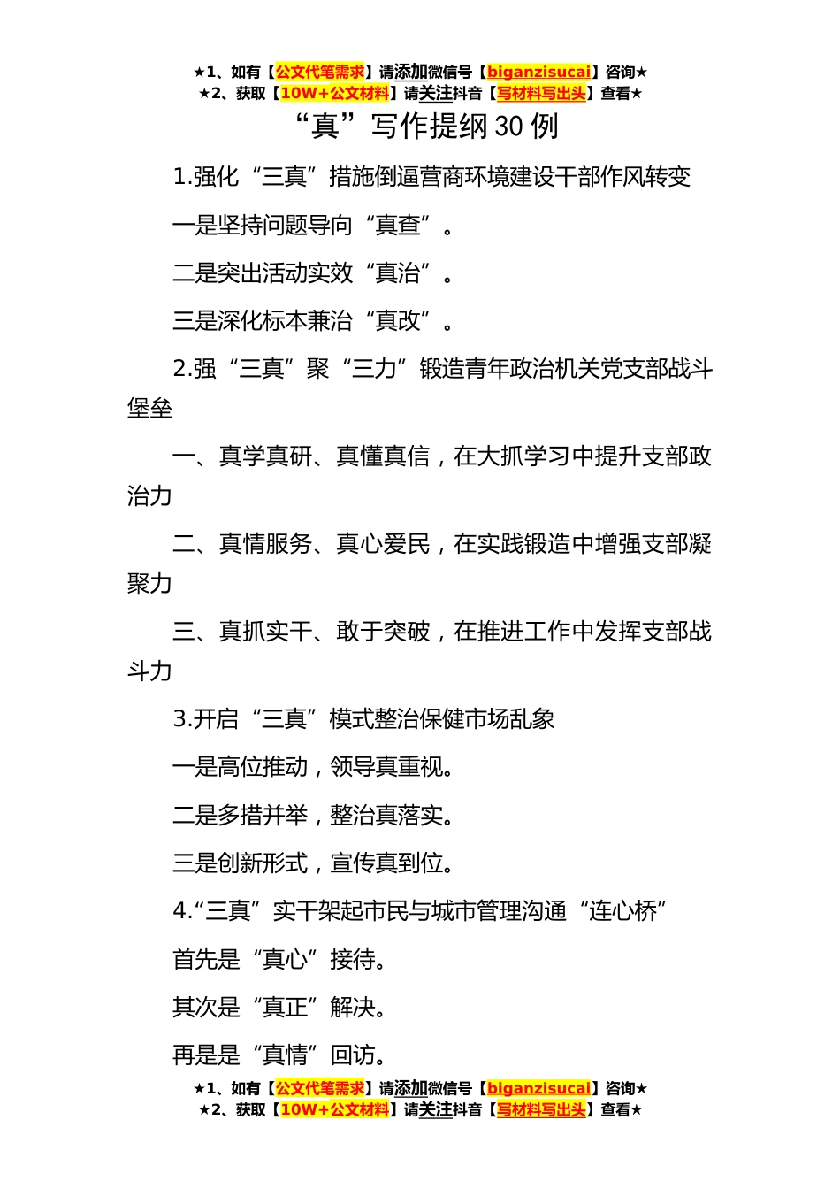 ★1、如有【公文代笔需求】请添加微信号【biganzisucai】咨询★★2、获取【10W+公文材料】请关注抖音【写材料写出头】查看★★1、如有【公文代笔需求】请添加微信号【biganzisucai】咨询★★2、获取【10W+公文材料】请关注抖音【写材料写出头】查看★★1、如有【公文代笔需求】请添加微信号【biganzisucai】咨询★★2、获取【10W+公文材料】请关注抖音【写材料写出头】查看★“真”写作提纲30例1.强化“三真”措施倒逼营商环境建设干部作风转变一是坚持问题导向“真查”。二是突出活动实效“真治”。三是深化标本兼治“真改”。2.强“三真”聚“三力”锻造青年政治机关党支部战斗堡垒一、真学真研、真懂真信,在大抓学习中提升支部政治力二、真情服务、真心爱民,在实践锻造中增强支部凝聚力三、真抓实干、敢于突...