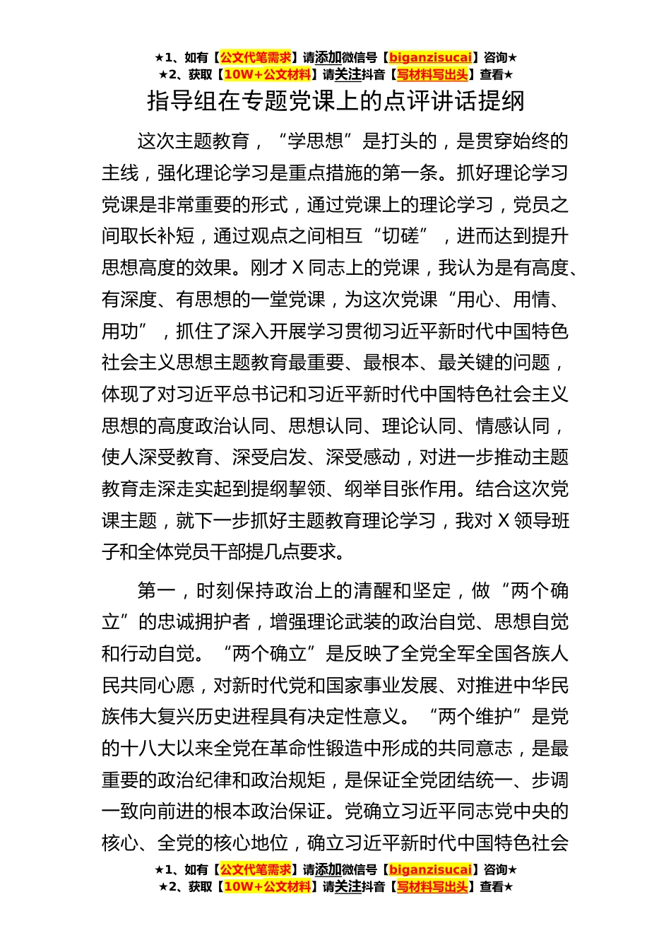 ★1、如有【公文代笔需求】请添加微信号【biganzisucai】咨询★★2、获取【10W+公文材料】请关注抖音【写材料写出头】查看★★1、如有【公文代笔需求】请添加微信号【biganzisucai】咨询★★2、获取【10W+公文材料】请关注抖音【写材料写出头】查看★★1、如有【公文代笔需求】请添加微信号【biganzisucai】咨询★★2、获取【10W+公文材料】请关注抖音【写材料写出头】查看★指导组在专题党课上的点评讲话提纲这次主题教育,“学思想”是打头的,是贯穿始终的主线,强化理论学习是重点措施的第一条。抓好理论学习党课是非常重要的形式,通过党课上的理论学习,党员之间取长补短,通过观点之间相互“切磋”,进而达到提升思想高度的效果。刚才X同志上的党课,我认为是有高度、有深度、有思想的一堂党课,为这次党课...
