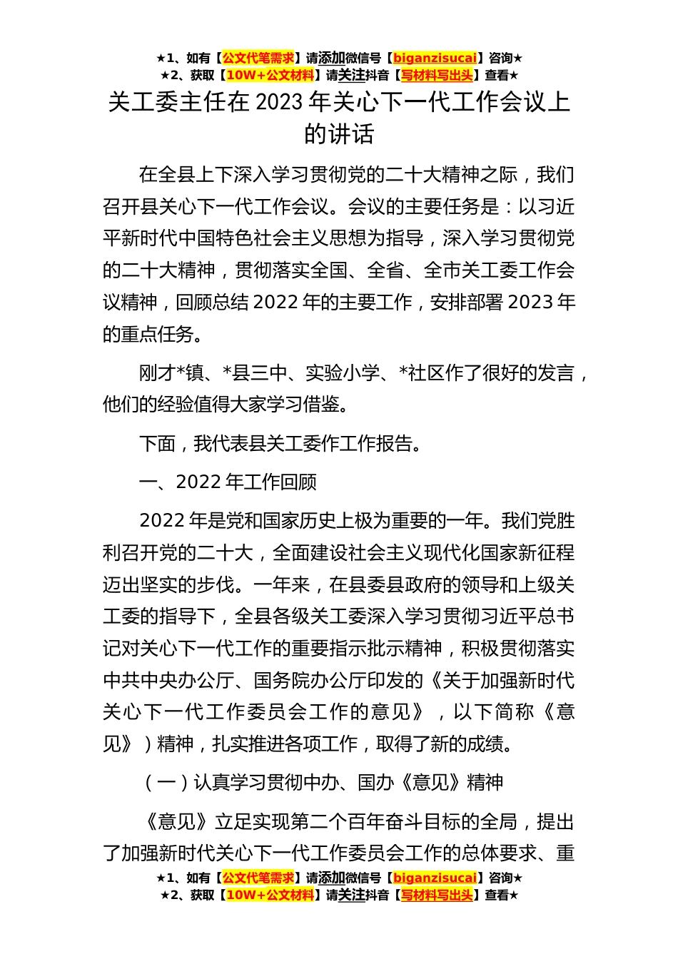 ★1、如有【公文代笔需求】请添加微信号【biganzisucai】咨询★★2、获取【10W+公文材料】请关注抖音【写材料写出头】查看★★1、如有【公文代笔需求】请添加微信号【biganzisucai】咨询★★2、获取【10W+公文材料】请关注抖音【写材料写出头】查看★★1、如有【公文代笔需求】请添加微信号【biganzisucai】咨询★★2、获取【10W+公文材料】请关注抖音【写材料写出头】查看★关工委主任在2023年关心下一代工作会议上的讲话在全县上下深入学习贯彻党的二十大精神之际,我们召开县关心下一代工作会议。会议的主要任务是:以习近平新时代中国特色社会主义思想为指导,深入学习贯彻党的二十大精神,贯彻落实全国、全省、全市关工委工作会议精神,回顾总结2022年的主要工作,安排部署2023年的重点任务。刚才*镇、*县三...