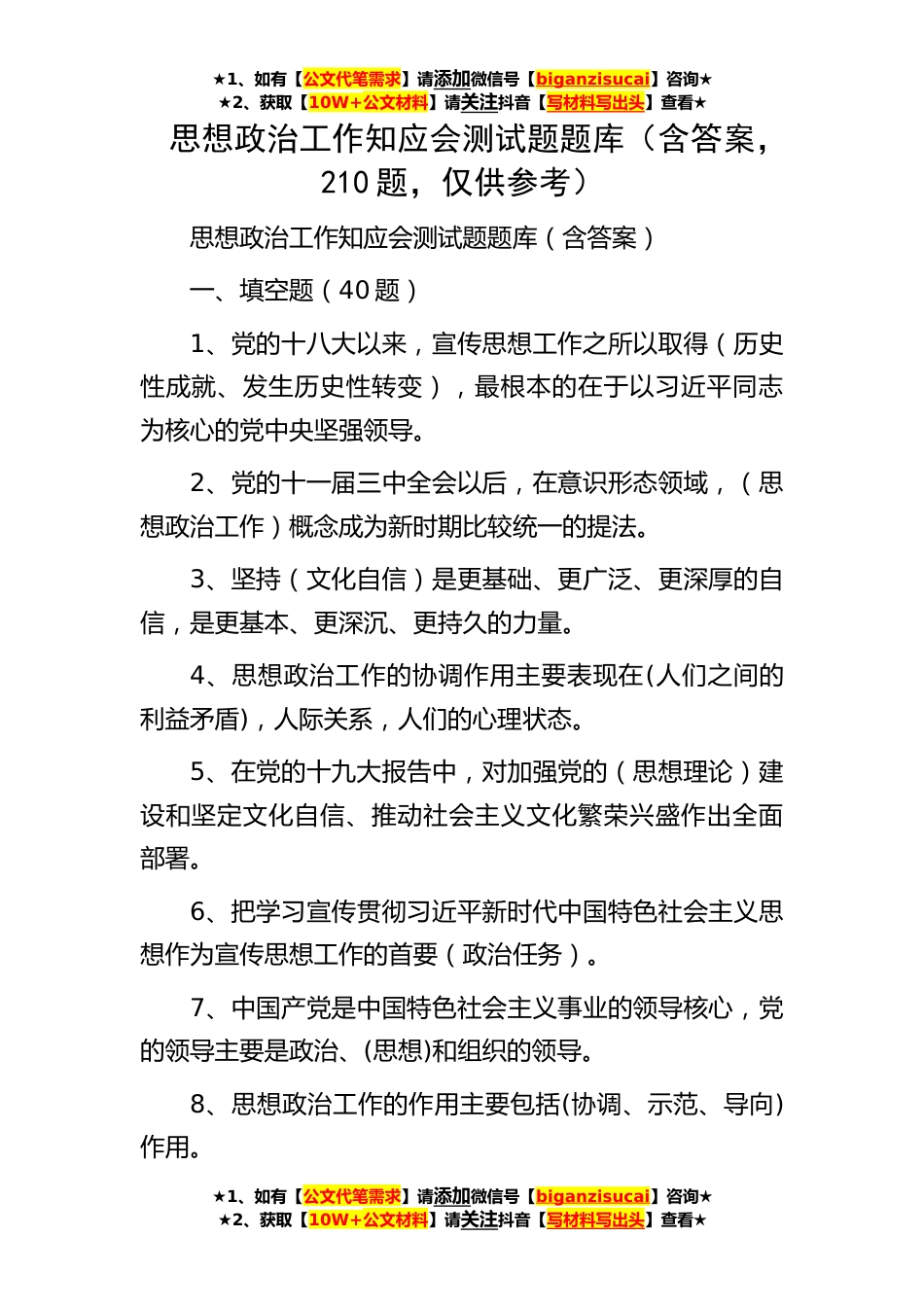 ★1、如有【公文代笔需求】请添加微信号【biganzisucai】咨询★★2、获取【10W+公文材料】请关注抖音【写材料写出头】查看★★1、如有【公文代笔需求】请添加微信号【biganzisucai】咨询★★2、获取【10W+公文材料】请关注抖音【写材料写出头】查看★★1、如有【公文代笔需求】请添加微信号【biganzisucai】咨询★★2、获取【10W+公文材料】请关注抖音【写材料写出头】查看★思想政治工作知应会测试题题库(含答案,210题,仅供参考)思想政治工作知应会测试题题库(含答案)一、填空题(40题)1、党的十八大以来,宣传思想工作之所以取得(历史性成就、发生历史性转变),最根本的在于以习近平同志为核心的党中央坚强领导。2、党的十一届三中全会以后,在意识形态领域,(思想政治工作)概念成为新时期比较统一的...