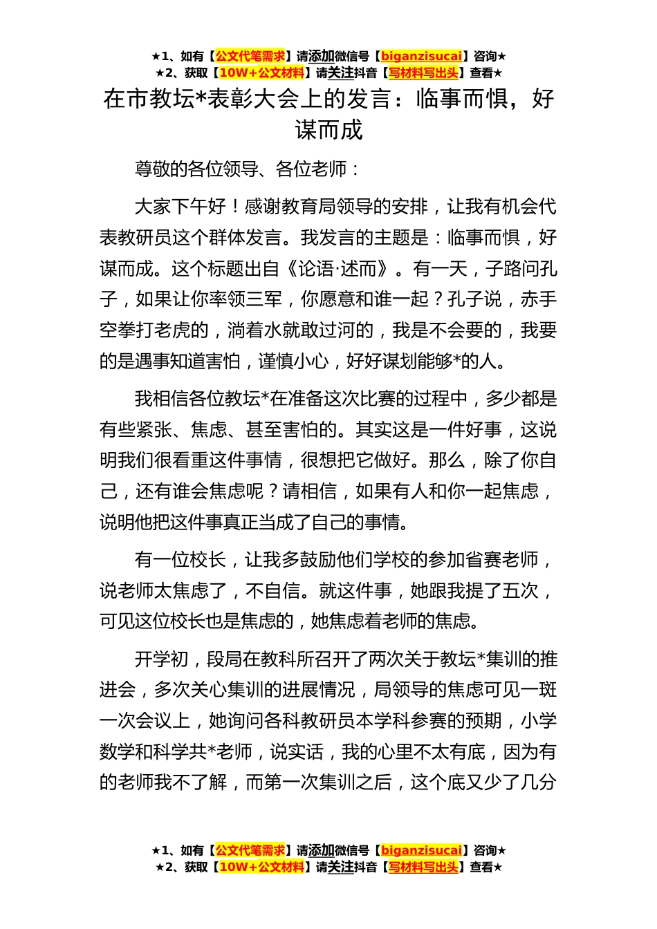 ★1、如有【公文代笔需求】请添加微信号【biganzisucai】咨询★★2、获取【10W+公文材料】请关注抖音【写材料写出头】查看★★1、如有【公文代笔需求】请添加微信号【biganzisucai】咨询★★2、获取【10W+公文材料】请关注抖音【写材料写出头】查看★★1、如有【公文代笔需求】请添加微信号【biganzisucai】咨询★★2、获取【10W+公文材料】请关注抖音【写材料写出头】查看★在市教坛*表彰大会上的发言:临事而惧,好谋而成尊敬的各位领导、各位老师:大家下午好!感谢教育局领导的安排,让我有机会代表教研员这个群体发言。我发言的主题是:临事而惧,好谋而成。这个标题出自《论语·述而》。有一天,子路问孔子,如果让你率领三军,你愿意和谁一起?孔子说,赤手空拳打老虎的,淌着水就敢过河的,我是不会要的,...