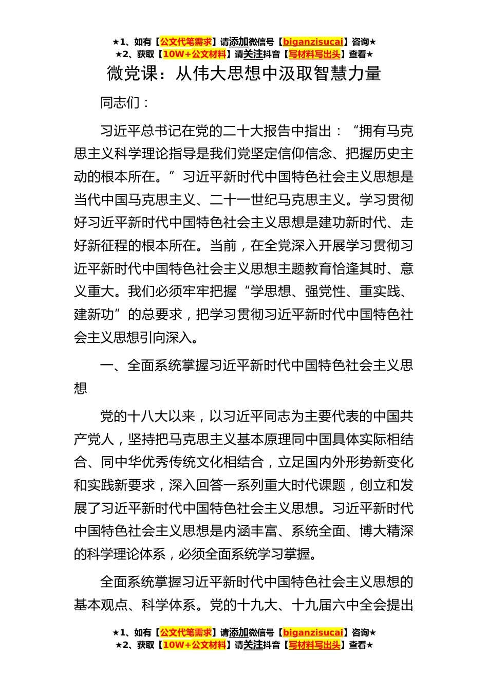 ★1、如有【公文代笔需求】请添加微信号【biganzisucai】咨询★★2、获取【10W+公文材料】请关注抖音【写材料写出头】查看★★1、如有【公文代笔需求】请添加微信号【biganzisucai】咨询★★2、获取【10W+公文材料】请关注抖音【写材料写出头】查看★★1、如有【公文代笔需求】请添加微信号【biganzisucai】咨询★★2、获取【10W+公文材料】请关注抖音【写材料写出头】查看★微党课:从伟大思想中汲取智慧力量同志们:习近平总书记在党的二十大报告中指出:“拥有马克思主义科学理论指导是我们党坚定信仰信念、把握历史主动的根本所在。”习近平新时代中国特色社会主义思想是当代中国马克思主义、二十一世纪马克思主义。学习贯彻好习近平新时代中国特色社会主义思想是建功新时代、走好新征程的根本所在。当前,在...