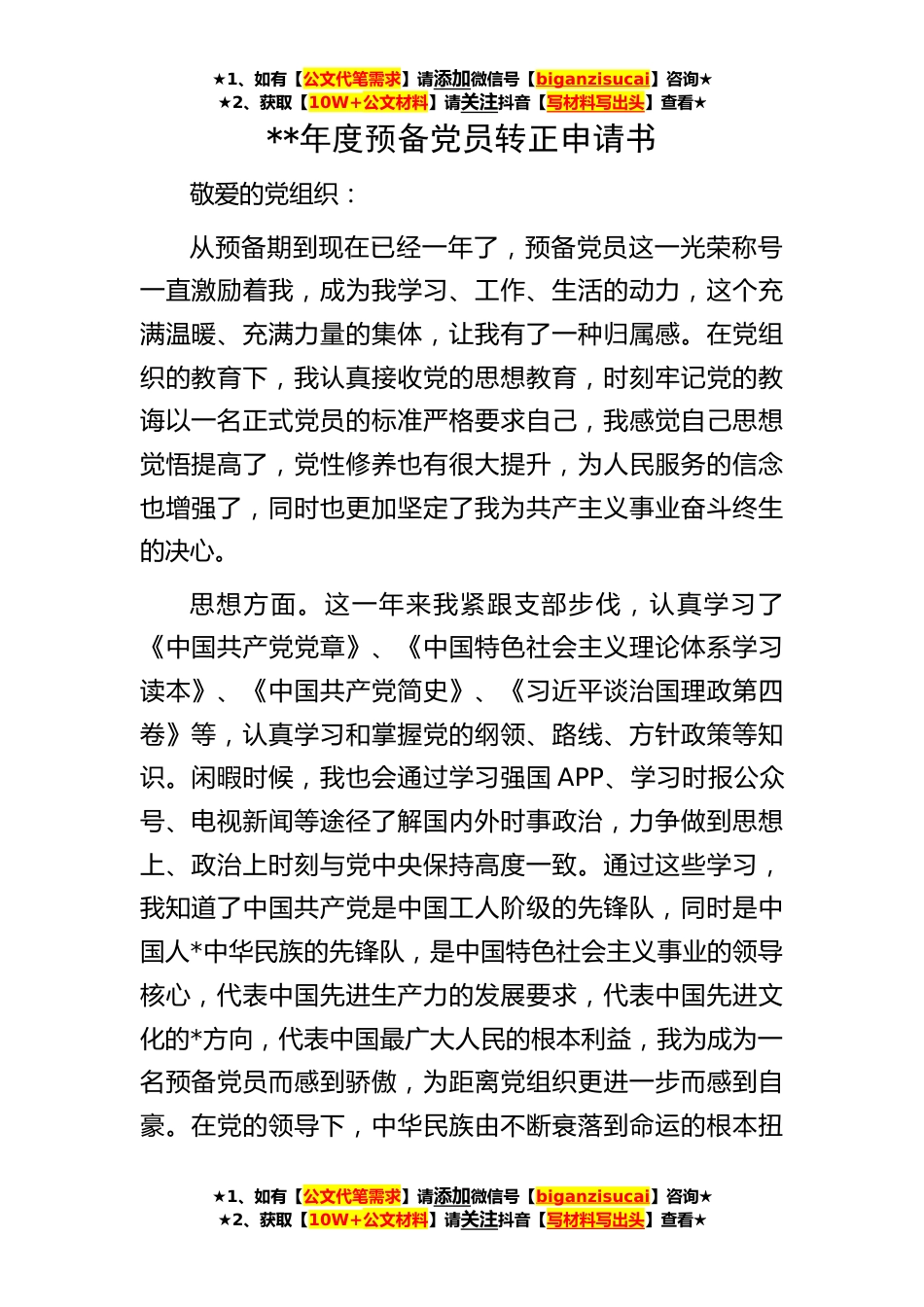 ★1、如有【公文代笔需求】请添加微信号【biganzisucai】咨询★★2、获取【10W+公文材料】请关注抖音【写材料写出头】查看★★1、如有【公文代笔需求】请添加微信号【biganzisucai】咨询★★2、获取【10W+公文材料】请关注抖音【写材料写出头】查看★★1、如有【公文代笔需求】请添加微信号【biganzisucai】咨询★★2、获取【10W+公文材料】请关注抖音【写材料写出头】查看★**年度预备党员转正申请书敬爱的党组织:从预备期到现在已经一年了,预备党员这一光荣称号一直激励着我,成为我学习、工作、生活的动力,这个充满温暖、充满力量的集体,让我有了一种归属感。在党组织的教育下,我认真接收党的思想教育,时刻牢记党的教诲以一名正式党员的标准严格要求自己,我感觉自己思想觉悟提高了,党性修养也有很大提...