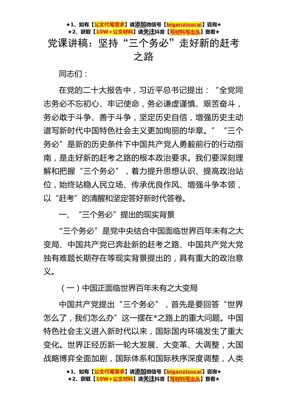 ★1、如有【公文代笔需求】请添加微信号【biganzisucai】咨询★★2、获取【10W+公文材料】请关注抖音【写材料写出头】查看★★1、如有【公文代笔需求】请添加微信号【biganzisucai】咨询★★2、获取【10W+公文材料】请关注抖音【写材料写出头】查看★★1、如有【公文代笔需求】请添加微信号【biganzisucai】咨询★★2、获取【10W+公文材料】请关注抖音【写材料写出头】查看★党课讲稿:坚持“三个务必”走好新的赶考之路同志们:在党的二十大报告中,习近平总书记提出:“全党同志务必不忘初心、牢记使命,务必谦虚谨慎、艰苦奋斗,务必敢于斗争、善于斗争,坚定历史自信,增强历史主动谱写新时代中国特色社会主义更加绚丽的华章。”“三个务必”是新的历史条件下中国共产党人勇毅前行的行动指南,是走好新的赶考...