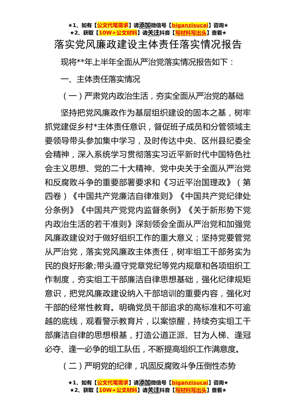 ★1、如有【公文代笔需求】请添加微信号【biganzisucai】咨询★★2、获取【10W+公文材料】请关注抖音【写材料写出头】查看★★1、如有【公文代笔需求】请添加微信号【biganzisucai】咨询★★2、获取【10W+公文材料】请关注抖音【写材料写出头】查看★★1、如有【公文代笔需求】请添加微信号【biganzisucai】咨询★★2、获取【10W+公文材料】请关注抖音【写材料写出头】查看★落实党风廉政建设主体责任落实情况报告现将**年上半年全面从严治党落实情况报告如下:一、主体责任落实情况(一)严肃党内政治生活,夯实全面从严治党的基础坚持把党风廉政作为基层组织建设的固本之基,树牢抓党建促乡村*主体责任意识,督促班子成员和分管领域主要领导带头参加集中学习,及时传达中央、区州县纪委全会精神,深入系统学习贯...